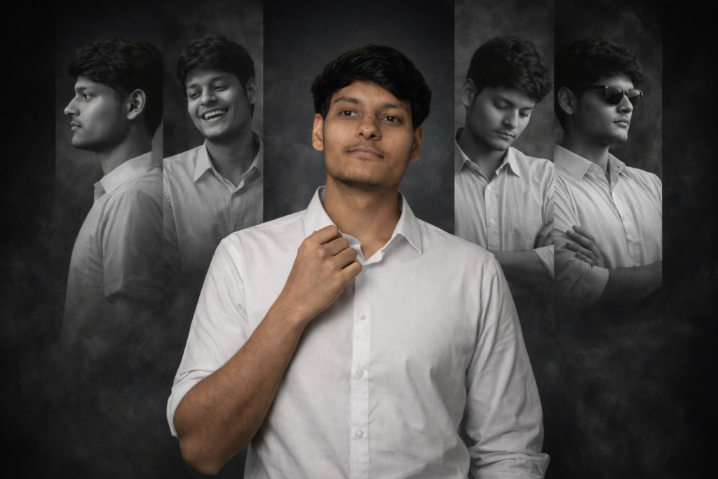 Ultra-realistic 8K cinematic collage portrait of me (use uploaded face – 100% facial accuracy, no facial changes, no skin smoothing, no extra brightness, keep natural skin tone). my white shart use, Collage Structure: – Center: Large full-color portrait (waist-up) – Background: 5 vertical monochrome panels of the same person Center Pose: Standing confidently, shoulders relaxed One hand lightly adjusting shirt collar Head slightly tilted, eyes looking forward-left Expression: calm confidence, subtle smile Background Panels (Black & White): 1. Serious side profile 2. Natural laugh candid 3. Looking down, thoughtful 4. Arms crossed power pose 5. Sunglasses look, bold attitude Lighting: Soft cinematic key light on face Strong contrast for monochrome panels Natural shadows preserved Background: Dark gradient background with subtle smoke texture Very light grain for cinematic depth Style: Professional editorial collage Luxury personal-branding vibe Instagram viral aesthetic Photorealistic photography only. Do not edit or change my face.