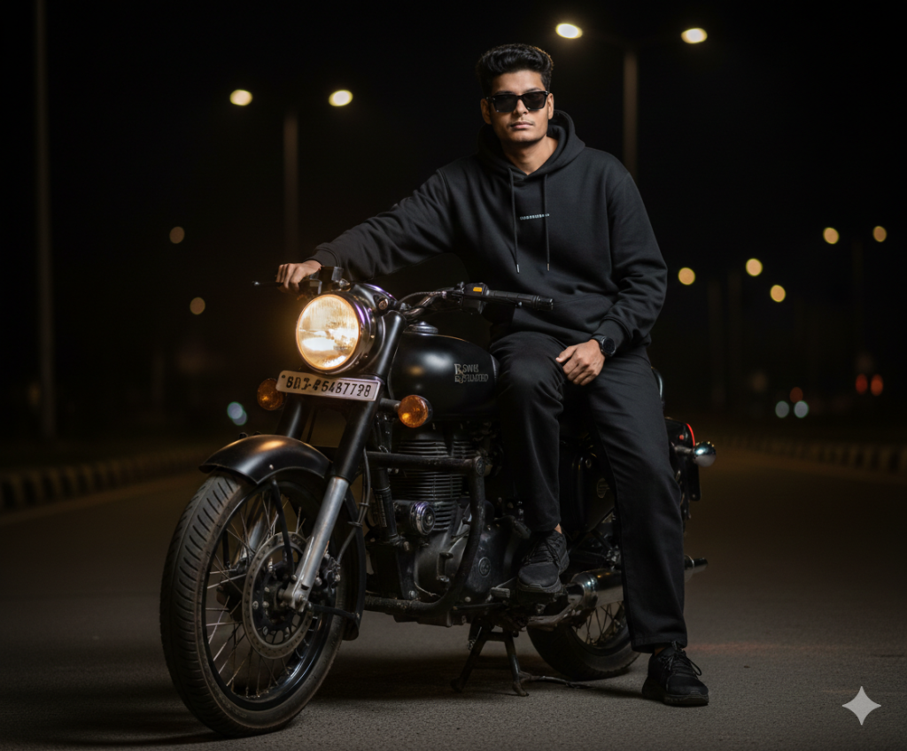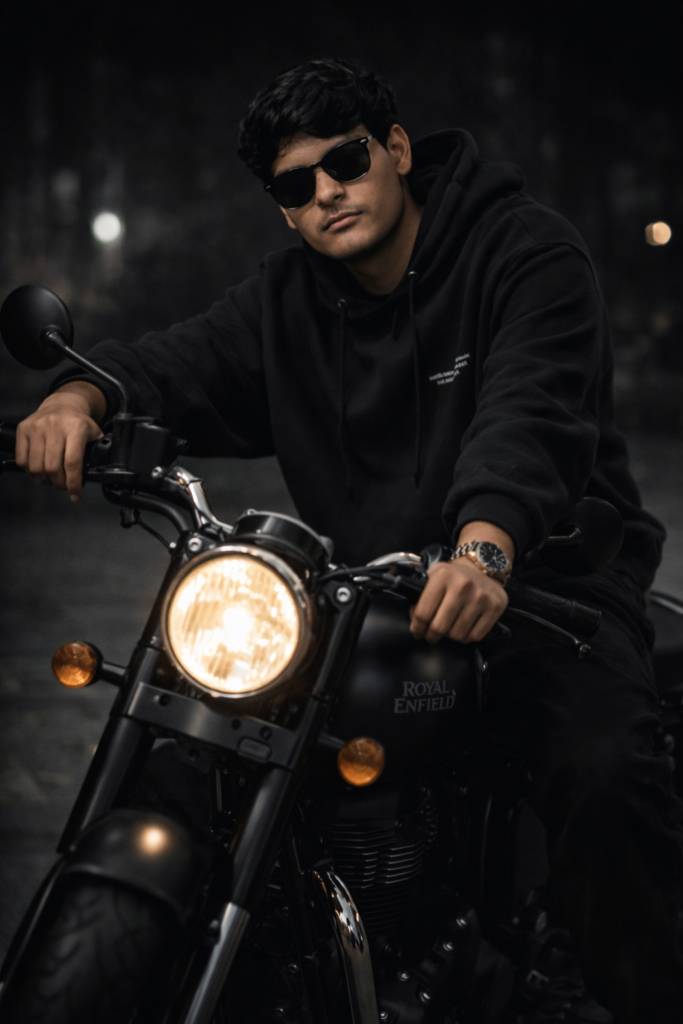 Keep face 100% original and unchanged. No face reshaping, no beauty filter, no Al facial modification. Preserve real skin texture, facial features, expression, and identity exactly as original. ASPECT RATIO: 3:4 OUTFIT DETAILS Black oversized hoodie with minimal text detail Loose black wide-leg pants Dark sneakers – black sunglasses luxury All-black streetwear aesthetic No outfit change, same fabric texture MAIN SUBJECT: A young man sitting confidently on a black classic motorcycle at night, full attitude biker look, calm but dangerous presence. He is seated on the bike, slightly leaning forward, commanding posture. BIKE DETAILS: Royal Enfield Classic 350 Matte Black / Dark Stealth Black Classic retro body Chrome details subtle and darkened Headlight ON with warm yellow glow (If needed: scale-model look 1:12 cinematic miniature realism) POSE DETAILS (RIDING ATTITUDE): Man seated on the bike One hand gripping the handle firmly Other hand relaxed near, Do not edit or change my face.