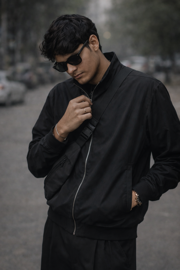 Keep my face same 100% same as in the reference image. Bk Ultra realistic with high detall. Ultra-realletic natural outdoor street-style portrait of a young man, recreated exactly like the roference image. ASPECT RATIO: 3:4 (portrait) SUBJECT DETAILS: Young male, siim lean build. Light to medium skin tone. Medium-length straight hair with slightly messy fringe. Head slightly tilted downward, eyes looking down. Calm, composed mood. OUTFIT DETAILS: Black lightweight zip-up jacket with subtle sheen. Black wide-fit tailored trousers. Black chunky leather shoes. Black crossbody sling bag worn diagonally across chest. Minimal accessories only. POSE DETAILS: Jacket Adjust / Zipper Pull Pose One hand pulling or adjusting the zipper of your jacket (like in your photo), the other hand on your hip or touching your beard. slight side angle, head tilted down a bit while looking up through the sunglasses-super sharp and cinematic. EXPRESSION DETAILS: Neutral, calm, confident expression. N, Do not edit or change my face.