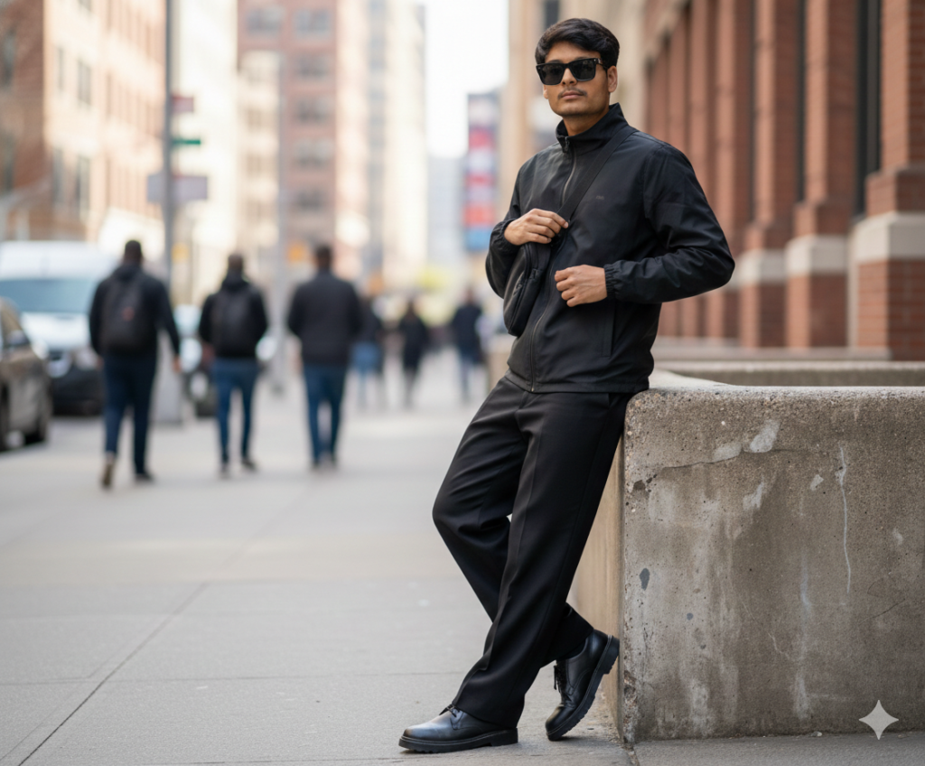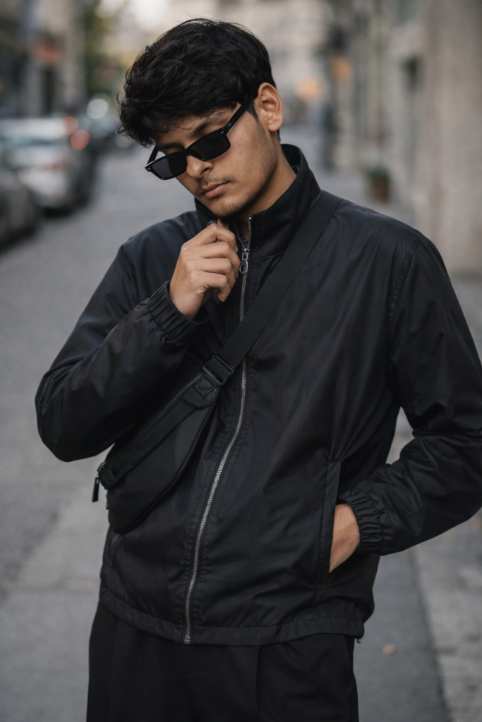 Keep my face same 100% same as in the reference Image. 8k Ultra realistic with high detall. Ultra-realistic natural outdoor street-style portrait of a young man, recreated exactly like the reference image. ASPECT RATIO: 3:4 (portrait) SUBJECT DETAILS: Young male, slim lean bulld. Light to medium skin tone. Medium-length straight hair with slightly messy fringe. Head slightly tilted downward, eyes looking down. Calm, composed mood. OUTFIT DETAILS: Black lightweight zip-up Jacket with subtle sheen. Black wide-fit tallored trousers. Black chunky leather shoes. Black crossbody sling bag worn diagonally across chest. Minimal accessories only. POSE DETAILS: Jacket Adjust/ Zipper Pull Pose One hand pulling or adjusting the zipper of your Jacket (like in your photo), the other hand on your hip or touching your beard. Silght side angle, head tilted down a bit while looking up through the sunglasses-super sharp and cinematic. EXPRESSION DETAILS: Neutral, calm, confident expression. N Do not edit or change my face.