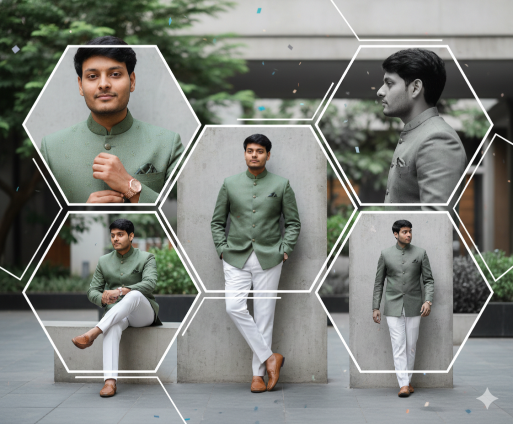 Ultra-realistic 8K vertical birthday collage portrait, strictly male version. Character (use uploaded face 100% facial accuracy, natural male skin texture, no changes) wearing – Sage green bandhgala jacket with minimal embroidery – White straight pants – Tan leather loafers – Rose gold watch and thin chain bracelet Collage layout (100% exact multi-panel design): – Center largest panel (full natural color): Relaxed leaning against wall, hands in pockets, subtle confident smirk, direct gaze – Five geometric hexagon panels around center (cool monochrome with green accents): – Top: Close-up eyes and smile – Left: Hands adjusting watch – Right: Side profile looking away – Bottom-left: Seated pose with legs crossed – Bottom-right: Walking toward camera Panels connected with clean white lines and soft geometric overlaps Background & effects: – Blurred modern minimalist courtyard with plants and concrete – Subtle floating geometric confetti particles – Clean crisp atmosphere Lighting: – Cool natural daylight with soft shadows in color panel – High-key bright lighting in monochrome panels Ultra-sharp 8K fabric weave, watch reflection, and skin detail Style: 100% photorealistic birthday tribute collage, modern ethnic fusion menswear vibe, exact hexagonal geometric arrangement, confident relaxed poses – strictly male, no female elements, no text, Do not edit or change my face.