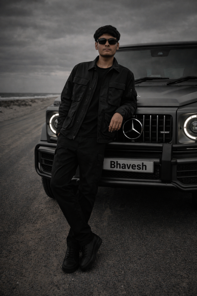 A high-quality, full-body cinematic shot of a stylish young 18 years boy with dark hair and a Not Use beard, Sunglass add, wearing premium all-black urban streetwear including a black utility jacket, black trousers, and dark sunglasses. He is leaning confidently against the front of a modern, matte grey Mercedes-Benz G- Wagon big, and number plate text “Bhavesh” with a prominent bull bar and glowing circular LED headlights. The setting is a desolate, sandy coastal road under a heavy, overcast grey sky. The mood is moody and high-end with a muted, nearly monochromatic color palette. Professional lighting with sharp focus, low-angle perspective, hyper-realistic textures, 8k resolution, fashion editorial style.” 100% my face same, I need this prompt picture, g wagon logo watching this photo, Do not edit or change my face.