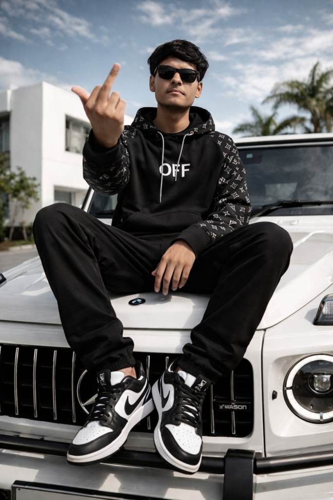 A professional, high-resolution full-body cinematic photograph of a stylish and rugged young 18 years boy, Not use a byerd, use sunglass, sitting confidently on the hood of a pristine white Mercedes-Benz G- Wagon. He is wearing premium black and white urban streetwear, including a designer logo hoodie, black joggers, and high-end sneakers. He has a bold expression, looking directly at the camera. The background features a modern white building and palm trees under bright, high- contrast natural daylight. Low-angle shot, ultra-realistic textures, 34k resolution, cinematic lighting, sharp focus. 100% my face same, I need this prompt picture, Boy showing middle finger in camera, Do not edit or change my face.