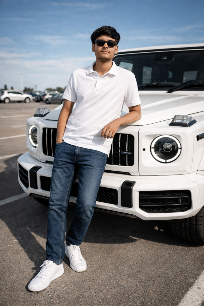 A photorealistic, cinematic full-body shot of a handsome young boys South Asian 18 years boy with a fit physique and short, styled dark hair and a Not Use beard, Use Sunglass. He is leaning confidently against the front fender of a pristine white Mercedes-Benz G-Class SUV in a sun- drenched outdoor parking lot. The man is dressed in a crisp white polo shirt, slim-fit blue denim jeans, and clean white sneakers. The background features a vast, clear blue sky and other parked vehicles in a soft-focus distance. The lighting is bright and natural, accentuating the sharp details of the man’s features and the glossy finish of the luxury vehicle. High-resolution, 34k, professional lifestyle photography style. 100% my face same, I need this prompt picture, g wagon logo watching this picture, Do not edit or change my face.
