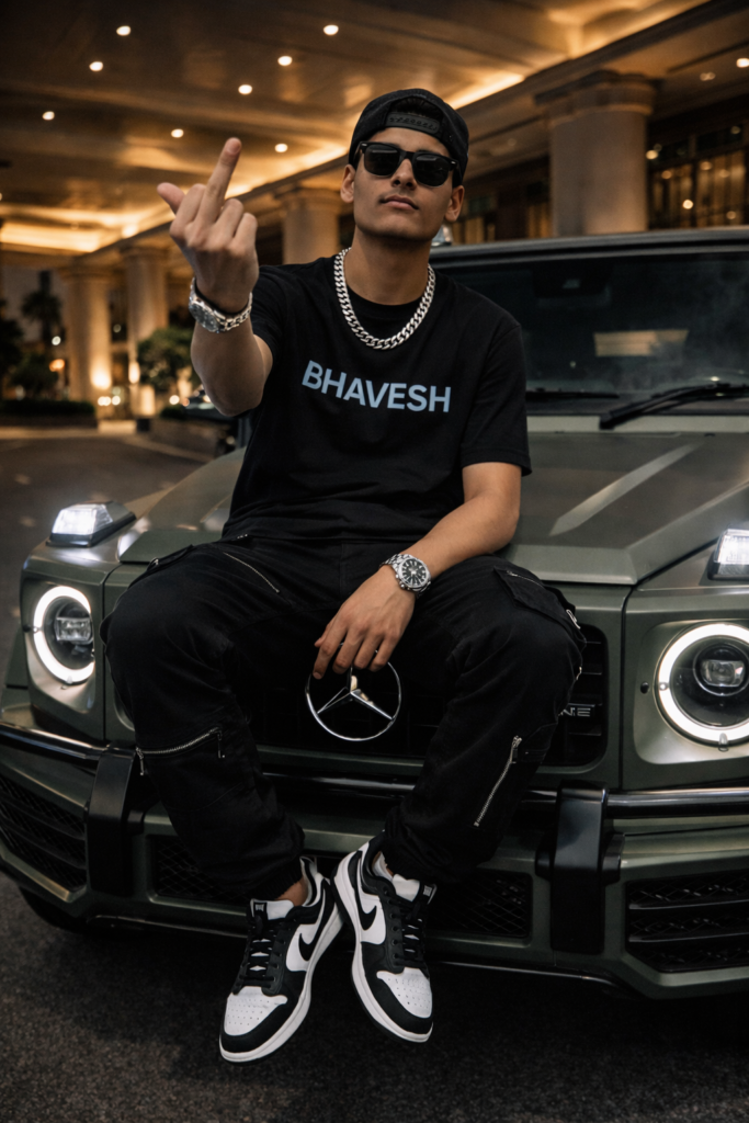 A high-resolution, cinematic lifestyle photograph of a stylish A Boy 18 years boy sitting confidently on the hood of a matte olive green Mercedes-Benz G-Wagon at night. He is wearing a premium black streetwear t- shirt with “BHAVESH” printed in light blue text, paired with black tactical cargo joggers featuring silver zipper details, Use Sunglass, a black baseball cap in back side, and designer sneakers. He is accessorized with a silver cuban link chain and a luxury watch. The setting is a grand, brightly lit entrance of a luxury hotel with massive architectural pillars and warm ambient ceiling lights. The SUV’s powerful LED headlights are turned on, creating a sharp, cool-toned lens flare that contrasts with the warm background glow. Hyper-realistic textures, urban luxury aesthetic, 8k resolution, sharp focus. 100% my face same, I need this prompt picture, man showing middle finger in camera, Do not edit or change my face.