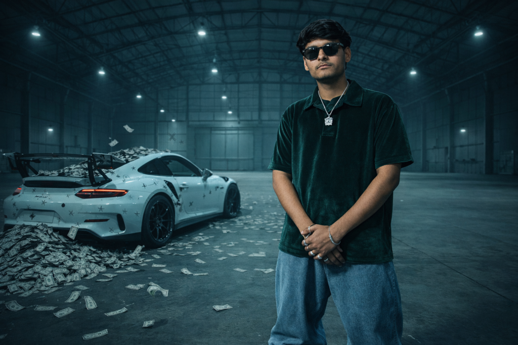 Keep face 100% same. Ultra-realistic cinematic wide-angle photograph inside a massive empty industrial warehouse hangar with high metal truss ceiling, exposed beams, and evenly spaced cold overhead industrial lights. Concrete floor, symmetrical background, large closed hangar doors centered behind subject. Cool teal and grey color grading, moody high-contrast lighting. Foreground right: A stylish Boy exactly 100% same as the uploaded image, with hair falling naturally toward the camera and forehead full body visible, slightly angled toward camera, hands clasped in front. Sleek VVS diamond around his neck. Visible hand and rings. Outfit: Rich Velvet Green half Polo Shirt. sunglasses to be 100% same as reference image. Very wide-leg Light Blue Velvet jeans (baggy fit, heavy drape). Black suede boots (UGG-style). Calm, same expression. Midground left: White Porsche 911 GT3 RS with black wheels and large rear wing spoiler. Trunk open, overflowing with stacks of 500 Indian Rupee bills. Black cross decals scattered across the car body panels. Large pile of Indian Rupee bills spilling out onto the concrete floor behind the car and spreading toward foreground. Several bills frozen mid-air as if recently thrown. Composition balanced: subject occupies right third, car occupies left third. Camera at waist height, slight wide lens distortion (24mm look). Deep depth of field, sharp focus throughout entire frame. Lighting: Overhead industrial lighting creating soft top-down highlights and subtle floor reflections. Cool ambient tone with slight cinematic teal shadows. No motion blur. Hyper-detailed, sharp textures, realistic skin imperfections, realistic fabric folds, crisp money details, commercial luxury street aesthetic, high dynamic range, 8k resolution, Do not edit or change my face
