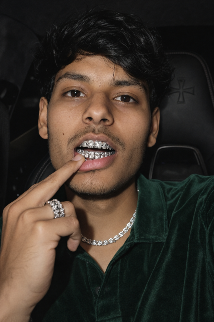 Ultra realistic close-up portrait of a rugged Boy sitting inside a car at night. The shot is framed tightly from chest to head, slightly angled perspective, camera positioned very close to the face (smartphone-style selfie framing), shallow depth of field. The man has: stylish man exactly 100% same as the uploaded image, with hair falling naturally toward the camera and forehead Hazel/Dark Brown Eyes with sharp clarity Same dark beard and mustache, well-groomed. Natural skin texture visible (pores, subtle freckles, slight under-eye redness, realistic imperfections) Slightly parted lips revealing full upper and lower teeth covered with diamond grills (bright, reflective, high-detail metallic shine) One finger pulling down the lower lip to display the grill He is wearing: Rich Velvet Green half Polo Shirt. Sleek WS diamond around his neck. Visible rings. Environment: Interior of a luxury vehicle Black leather seat with embossed cross symbol on the headrest Dim ambient interior lighting Strong frontal flash lighting illuminating face and jersey High contrast, sharp shadows, glossy highlights on skin and metal Lighting: Direct camera flash Hard highlights on forehead, nose, grill Deep shadow falloff behind subject High clarity, sharp focus Camera & Quality: 4K ultra sharp High dynamic range wide-angle distortion typical of wide angle selfie Hyperrealistic texture detail Instagram reel aesthetic Color grading: Neutral-to-cool tone High clarity Strong contrast Slight cinematic sharpness boost full torso visible Style keywords: hyperrealistic, ultra detailed, flash photography, high contrast portrait, luxury street aesthetic, sharp texture, crisp detail, photoreal, RAW image quality, Do not edit or change my face.