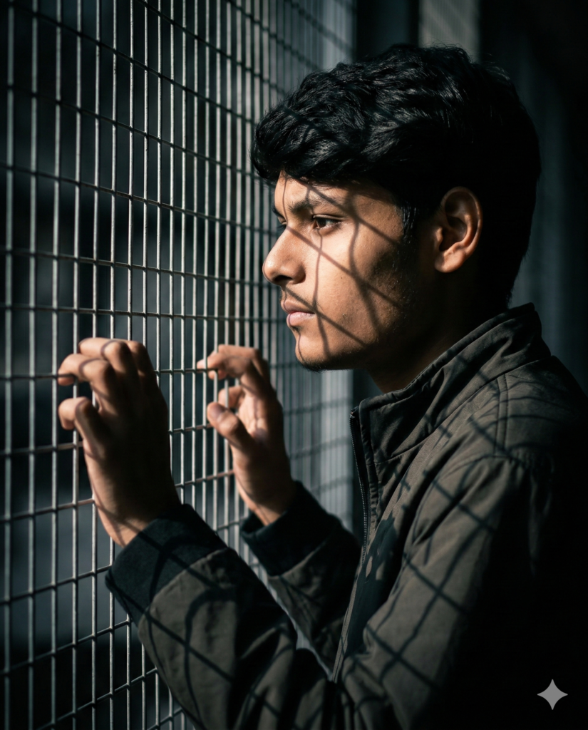 I am standing very close to a metal wire fence in a dimly l environment, preserving my real face exactly as in the reference image. The composition is vertical (4:5 ratio), tightly framed in a dramatic side profile shot. My body is positioned parallel to the fence, with my right side claser to the camera. The fence fills the left side of the frame, creating depth and structure. My posture is upright but slightly leaning toward the fence. Both of my hands are raised and placed against the metal grid at about chest and face level. My fingers are naturally spread and lightly gripping the cold metal wires. My elbows are bent, creating a subtie triangular shape with my arms. The gesture feels restrained and contemplative rather than forceful. My head is turned fully to the left in a clean side profile. My gaze is directed straight ahead through the fence, not toward the camera. My expression is serious, calm, and introspectives with a focused and slightly tense look. My face remains unchanged and highly detailed! am wearing a dark jacket with a matte texture and minimal detailing. The jacket has a structured f and subtle foids visible in the low light. The overall styling is monochromatic and understated, enhancing the moody cinemati tone. No headwear. Strong directional light enters from the left sid passing through the metal fence and casting sharp horizontal ans vertical shadow lines across my face and jacket. The light create dramatic contrast between iluminated areas and deep shadows. T shadow pattern from the grid is clearly visible across my skin anc clothing. The background is dark, softly blurred, and slightly vignett to intensify the atmosphere. Camera perspective: eye-level side profile shot, positioned close to me and slightly angled toward the fence Lens: 85mm portrait lens for compression and shallow depthe field. Depth of field: shallow my face and hands in sharp focus. fence slightly softened in the foreground, background heavily blurred Lighting: hard directional sunlight creating geometric shadow patterns. Ultra-realistic, cinematic, high contrast, dramatic interplay of light and shadow, detailed skin texture, moody atmosphere.. photorealistic. -ar 4:5, Do not edit or change my face.
