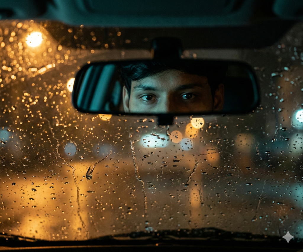 I am sitting in the driver’s seat of a car at night during heavy rain, seen through the interior rearview mirror. My face is reflected clearly in the rearview mirror, unchanged and exactly as in the reference image. Only the upper part of my face is visible within the mirror frame, tightly cropped so that my eyes dominate the composition. My body is facing forward toward the windshield. My shoulders are relaxed but squared, resting naturally against the seat. One hand is positioned on the steering wheel while the other rests lower near the center console, though neither hand is visible in the mirror reflection. My posture is upright and still, conveying quiet control. My eyes are looking directly into the camera lens through the rearview mirror reflection. My gaze is intense, steady, and unwavering fully locked with the viewer. My expression is serious, calm, and slightly mysterious, with subtle tension around the eyes. There is no smile, only focused presence and cinematic depth. I am wearing a dark, modern jacket with a smooth matte texture. The clothing blends into the dim car interior, minimalistic and understated, with no visible accessories. The windshield in front of me is covered with detailed raindrops and streaks of water, sharply textured in the foreground. Rain beads catch reflections of distant streetlights, creating warm golden-orange bok bokeh outside the car. en environment outside is blurred and atmospheric. Lighting is low-key and cinematic: cool teal-blue light softly luminates my face from the front, while warm amber highlights from streetlights glow through the rain, creating strong color contrast. The atmosphere feels dramatic and neo noir Camera perspective: close-up shot of the interior rearview mirror from inside the car at eye level.Lens: 85mm portrait lens, shallow depth of field (f/1.8), sharp focus on my eyes in the mirror reflection, foreground raindrops slightly blurred, background heavily blurred. Ultra-realistic, photorealistic, photorealistic, cinematic color grading, moody rain atmosphere, dramatic contrast, soft fim grain, high detail, Do not edit or change my face.
