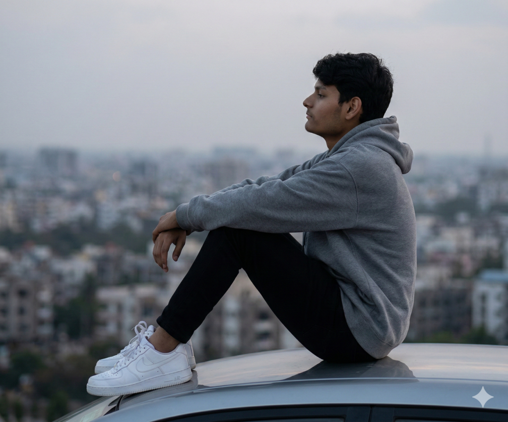 I am sitting on the smooth metal surface of a car roof, positioned near the edge, with my exact face preserved with perfect identity accuracy. My body is turned in full side profile relative to the camera, facing toward the distant horizon. My posture is relaxed and introspective. Both of my knees are bent and pulled close toward my chest, with my legs folded naturally in front of me. My feet are resting flat on the car roof surface, positioned side by side, with my ankles relaxed. My left arm is resting casually on top of my left knee, with my forearm angled slightly downward. My left hand is loosely holding a standard red aluminum Coca-Cola can near my shin, with my fingers naturally wrapped around it. The can has a glossy surface with realistic reflections and the classic white Coca-Cola script logo clearly visible. My grip is relaxed and natural. My right arm is bent at the elbow and resting across my knees, with my right hand relaxed and hanging naturally near my left forearm. My My shoulders are slightly rounded forward, reinforcing a calm. contemplative posture My head is turned fully to the side, showing a clean side profile. My chin is slightly raised, and my gaze is directed toward the distant horizon, not at the camera. My facial expression is calm, neutral, and introspective. I am not wearing any earrings.I am wearing a heavily oversized gray hoodie made of thick, soft cotton fabric. The hoodie has a loose, relaxed silhouette with dropped shoulders, wide sleeves, and excess fabric naturally bunching around my arms, torso, and waist. The hood rests loosely on my upper back, with visible folds and realistic fabric weight. The oversized fit creates a modern streetwear aesthetic. I am also weaning slim black pants with a clean tapered fit, creating contrast with the oversized upper garment. On my feet, I am wearing completely white Nike sneakers with no contrasting colors, featuring an all-white swoosh, white sole, white laces, and uniform white leather material. The sneakers show subtle natural creases and realistic material texture. The environment is outdoors. high above a city, with a soft, blurred urban landscape stretching into the distance. Buildings and greenery are partially obscured by atmospheric haze. The sky is overcast, producing soft, diffused natural lighting with gentle shadows and cinematic mood The camera perspective is side-on at approximately eye-level with my torso, capturing my full seated side profile. The focal length is approximately 85mm, creating natural background compression and shallow depth of field. My face, hoodie, and hands are in sharp focus while the distant city is softly blurred. Photorealistic detail, realistic skin texture, cinematic realism, natural lighting, authentic candid moment, professional photography, high resolution, Do not edit or change my face.