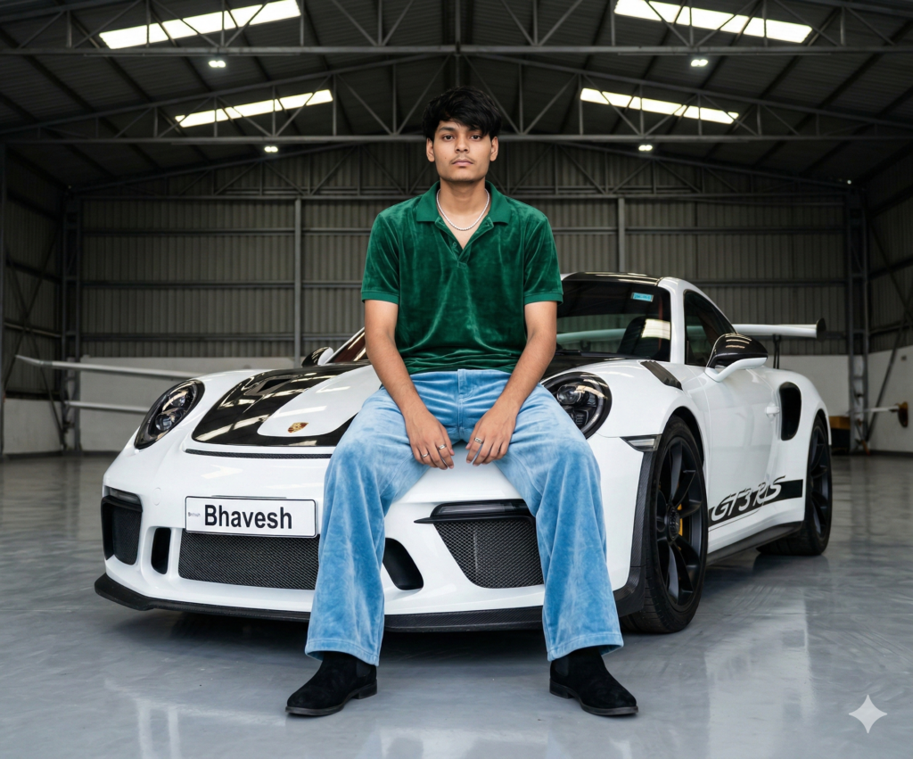 A stylish man exactly 100% same as the uploaded image, with hair falling naturally toward the camera and forehead, sits casually on the front hood of a white Porsche 911 GT3 RS inside a large industrial aircraft hangar. He is centered in frame, facing camera directly with a relaxed but dominant posture, legs apart, hands resting naturally between his knees. Neutral confident expression. He wears: Rich Velvet Green half Polo Shirt. Very wide-leg Light Blue Velvet jeans (baggy fit, heavy drape). Black suede boots (UGG-style). Sleek VVS diamond around his neck. Visible hand and rings. Car details: White Porsche 911 GT3 RS with black racing stripes running centrally across hood and roof Black carbon fiber hood vents Black rims with low-profile performance tires Large rear wing visible Side decal “GT3 RS” Front custom plate reading “Bhavesh” Environment: Massive clean aircraft hangar interior High metal truss ceiling with evenly spaced rectangular LED industrial lights White polished concrete floor with soft reflections Symmetrical architectural depth Minimal background clutter Lighting: Soft diffused overhead industrial lighting Even exposure, no harsh shadows Subtle reflections on car body Skin tones natural, realistic texture High dynamic range Camera: Slightly low angle (waist-level perspective) 35mm lens look Deep focus, entire subject and car sharp Professional commercial automotive photography style Crisp detail, high resolution, photorealistic Color grading: Clean neutral tones Slight cool temperature Strong contrast but not crushed blacks Premium automotive editorial aesthetic Composition: Subject centered Car filling majority of frame Full body visible including boots Symmetry emphasized by hangar structure Hyper-realistic, sharp focus, commercial automotive campaign vibe, luxury streetwear aesthetic, cinematic clarity, Do not edit or change my face.