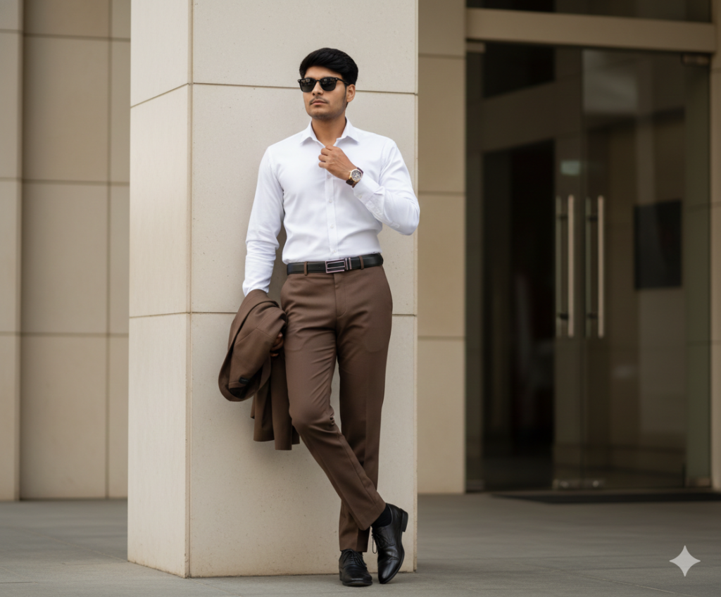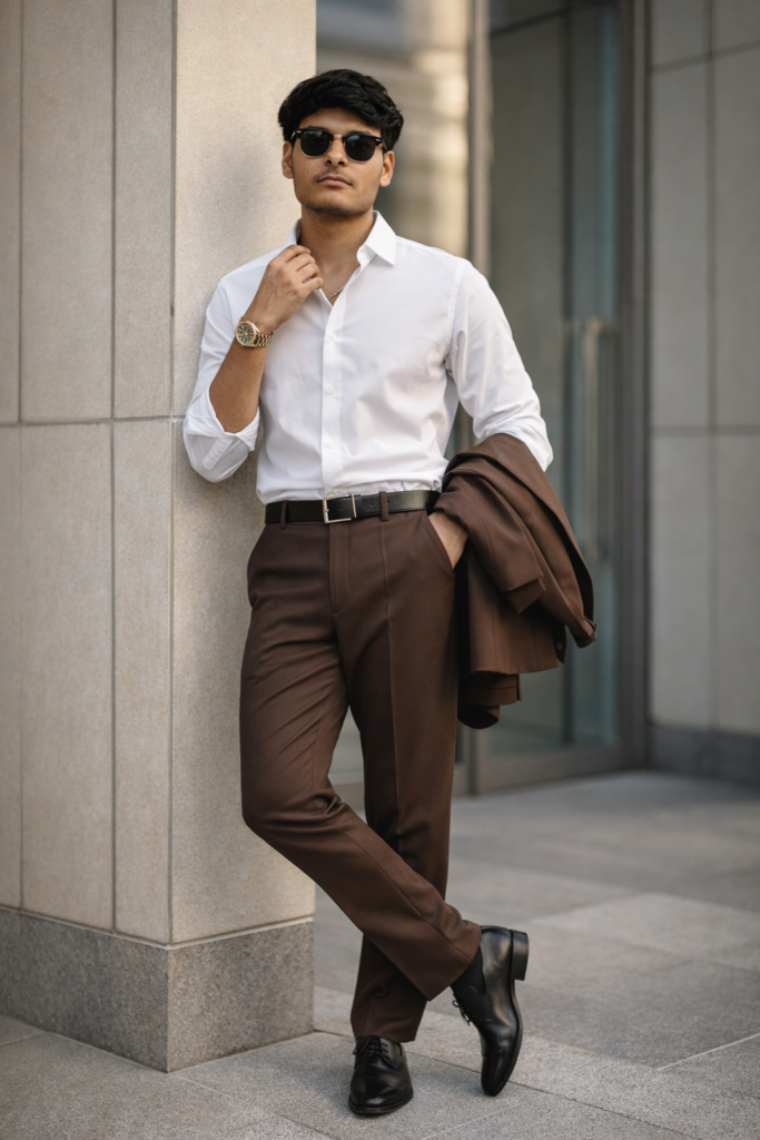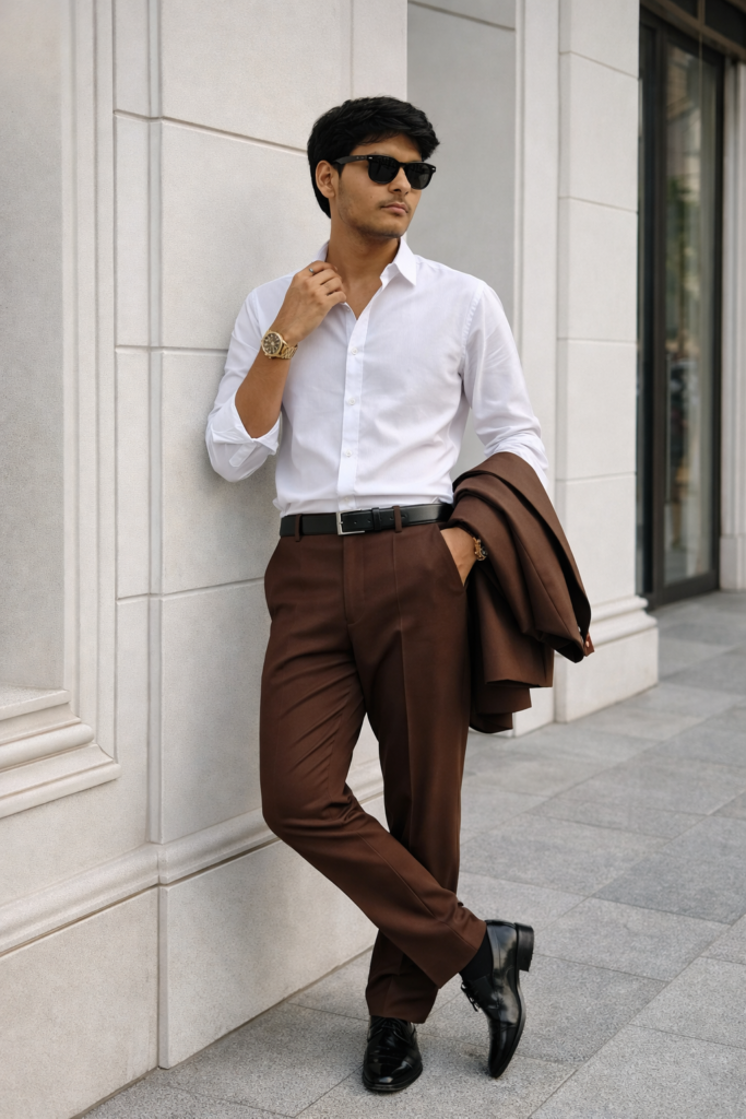 Create an image A stylish young man standing confidently outside a modern white building with decorative wall panels. He is wearing a crisp white button-down shirt tucked into high-waisted brown formal trousers. Ablack leather belt is visible. He holds a brown blazer casually over one arm. He wears black polished formal shoes, a gold wristwatch, and wearing a Sunglasses. His pose is relaxed and confident, one hand adjusting his shirt collar while looking to the side, not facing the camera. The setting is outdoors on a grey tiled floor near a white architectural wall with panel detailing. Soft natural daylight, slightly warm tone. The composition is full body, vertical frame. Background slightly blurred with shallow depth of field. Fashion editorial style, sharp focus, high detail, realistic lighting, premium lifestyle photography. Camera style: Full body shot, eye-level angle, 85mm lens look, f/ 2.8, natural light, shallow depth of field, high clarity, professional fashion photography. Style keywords: modern gentleman, classy, minimal, luxury fashion, confident pose, urban architecture, cinematic lighting, realistic, ultra-detailed. tish sam face match.