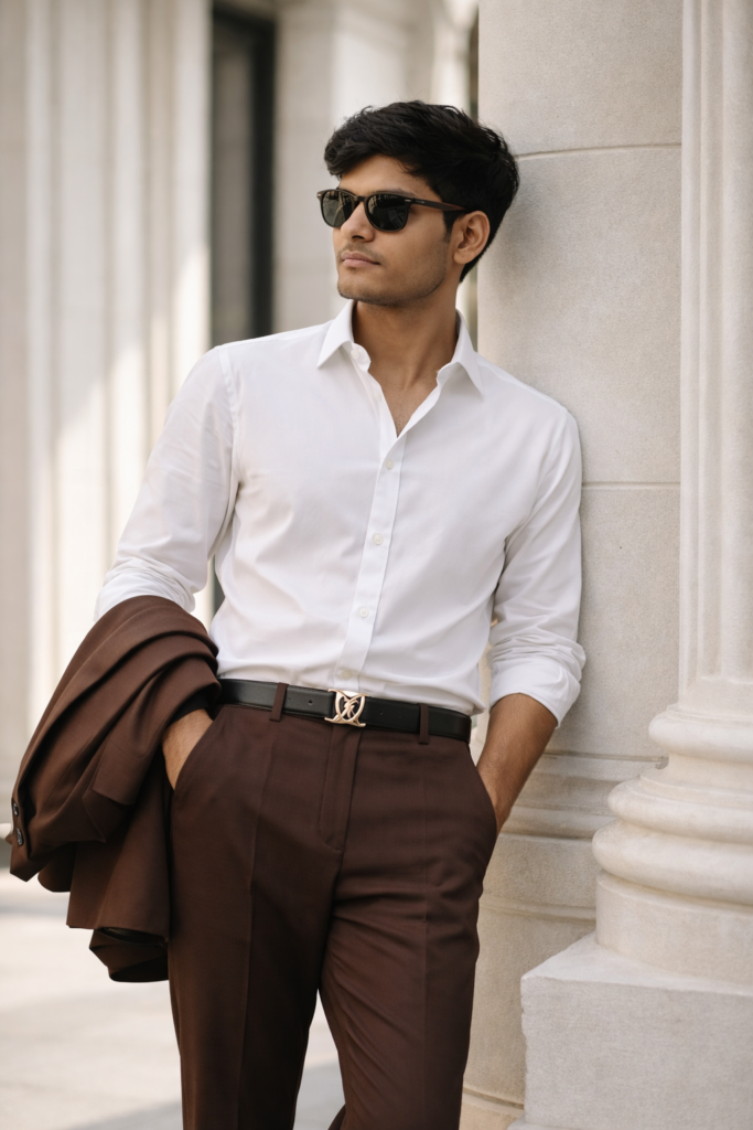 Create an image A stylish, well-groomed man leaning casually against a white classical architectural pillar outdoors. He is wearing a crisp white button-down shirt with sleeves rolled up to the forearms, fitted brown trousers, and a black designer belt with a metallic logo buckle. A brown blazer is draped over his left forearm. He wearsta gold wristwatch and wearing a Sunglasses He stands in a relaxed pose with one hand in his pocket, looking confidently to his left away from the camera). The background features elegant white walls and columns with soft natural daylight creating gentle shadows. The setting feels luxurious and minimal with clean architectural lines and a high-end aesthetic Lighting is bright, natural daylight with soft shadows. The color palette is neutral and classy- white, brown, black, and gold. The mood is confident modern, and fashionable. Camera & Style Details: Medium full-body shot, slightly low angle Shallow depth of field, background softly blurred High resolution, sharp focus on subject Editorial fashion photography style Natural color grading, realistic tones Outdoor daylight photography Keywords: fashion portrait, luxury style, confident pose, white architecture, modern gentleman, clean aesthetic, sunglasses, gold watch, blazer on arm, brown trousers, white shirt.