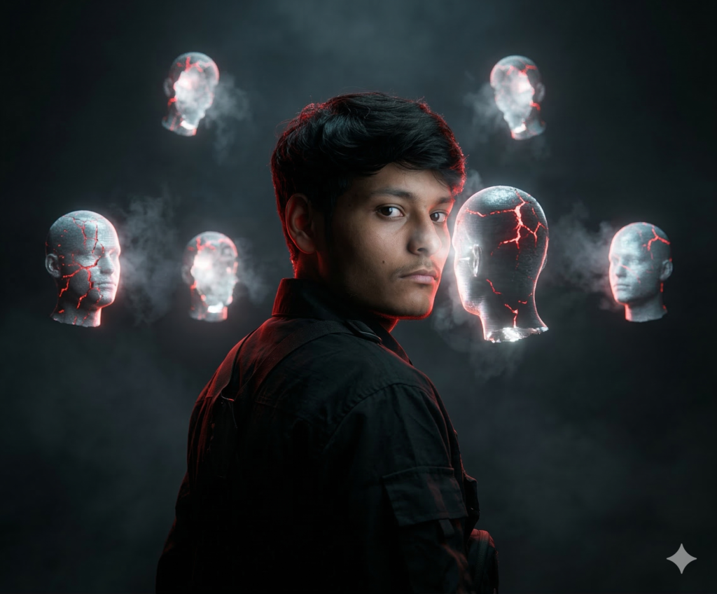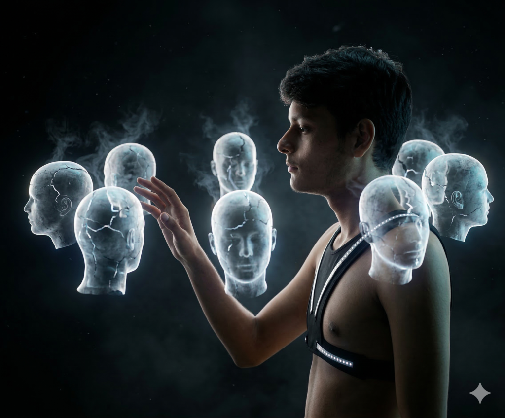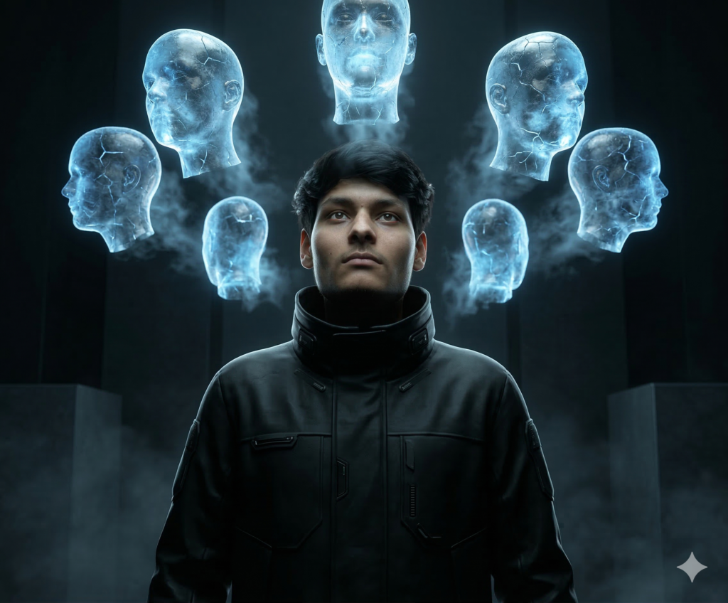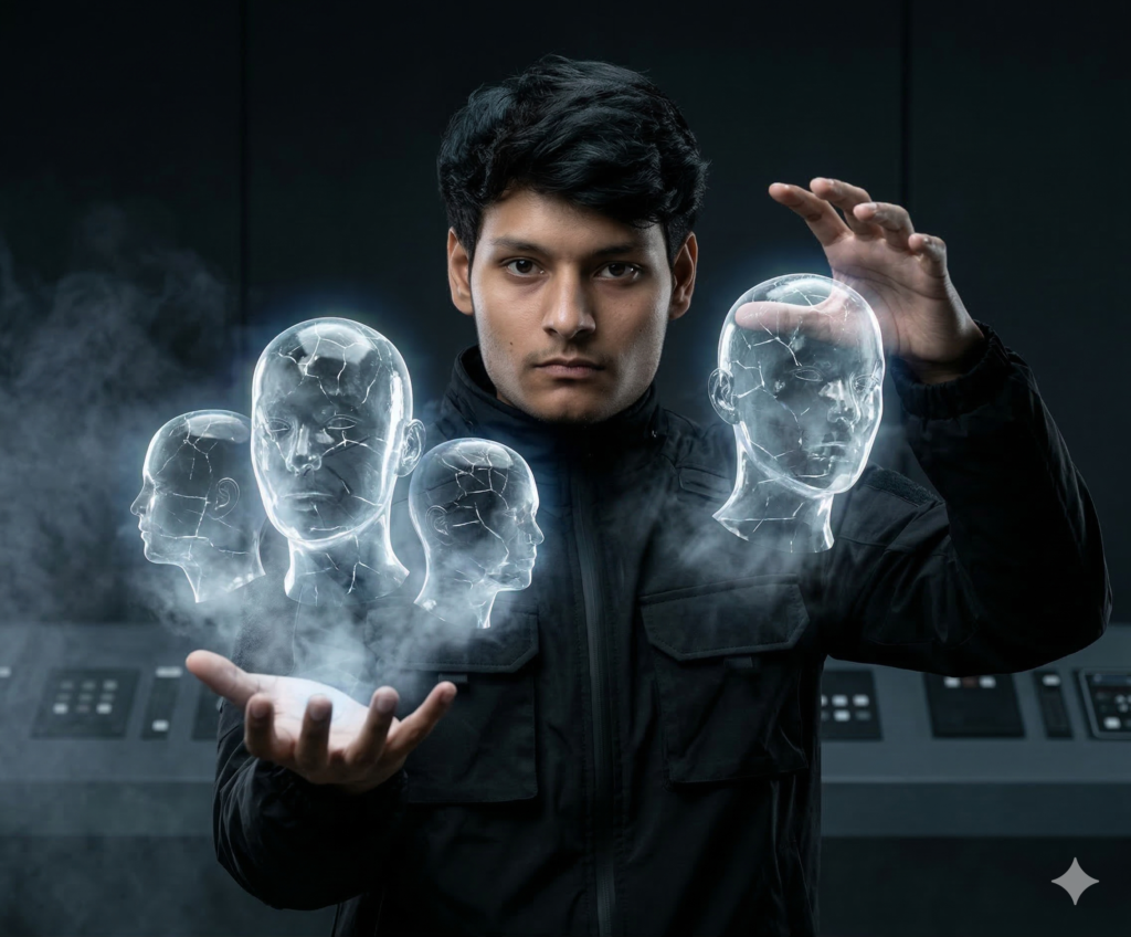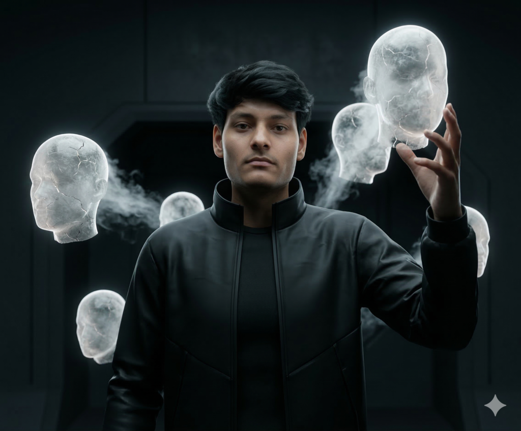 Create a cinematic, ultra-realistic sci-fi portrait of a man standing at the center of a dark, minimal environment. Use the uploaded reference image to preserve the subject’s face with 100% accuracy, keeping the exact facial structure, proportions, skin texture, eyes, nose, lips, jawline, and hairstyle unchanged. The identity must remain identical to the reference image. The man is surrounded by multiple floating human heads arranged around him. These heads appear translucent and cracked, like broken glass or digital holograms, softly glowing and releasing thin streams of mist or smoke, symbolizing multiple minds or parallel identities. The subject raises one hand forward as if interacting with the floating faces. Outfit: The man wears a minimalist futuristic outfit in matte black a clean, modern jacket or coat with subtle techwear details and a fitted silhouette, paired with a dark inner layer. The outfit has no logos, no text, and no visible branding, maintaining a sleek, Do not edit or change my face.