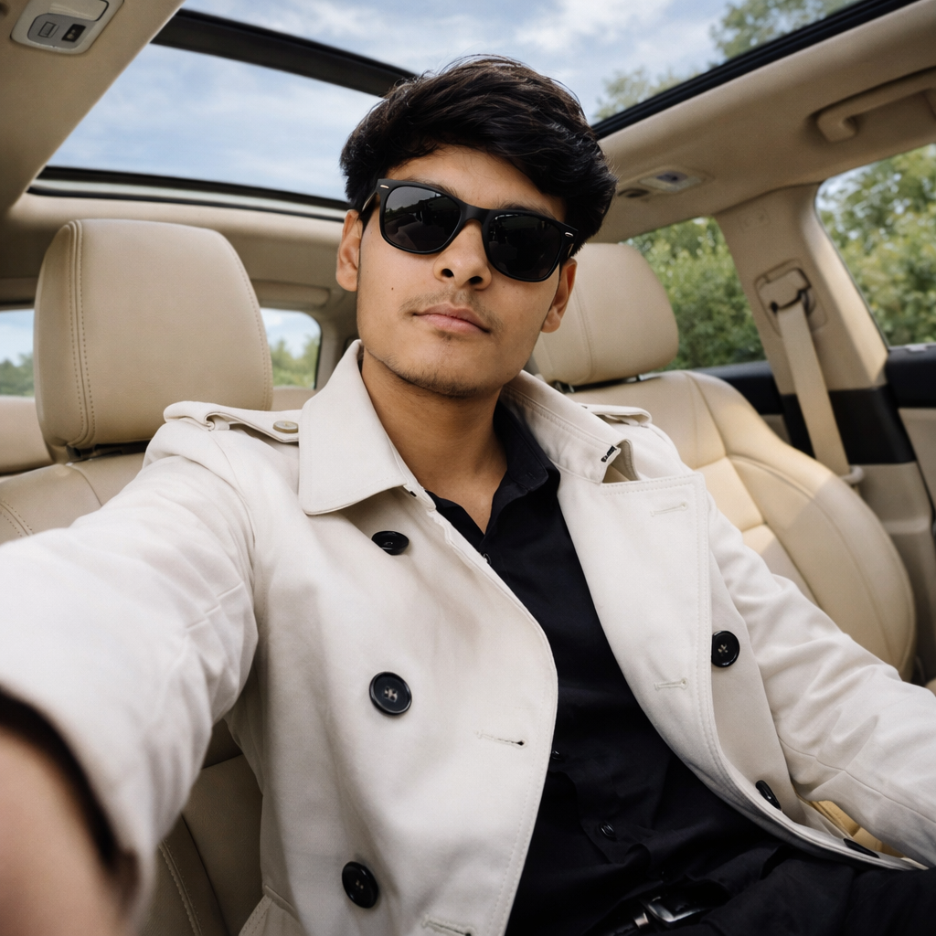 Create an image A handsome young Boy 18 years sitting inside a modern luxury car with beige leather interior and a panoramic sunroof open above him. He is taking a selfie from a slightly low, Not Use byard wide-angle perspective with his arm extended toward the camera. He is wearing a Sunglasses, and a calm confident expression while looking directly at the camera. He is wearing a stylish white double-breasted trench coat with black buttons over a black shirt and black pants. Natural daylight is coming through the sunroof and windows, creating soft, even lighting on his face. Trees and sky are visible outside the car windows. The composition feels clean, premium, and lifestyle-oriented. The car seats are beige leather, and the overall color palette is warm and elegant. Realistic photography style, high detail, sharp focus, cinematic natural light, DSLR quality, 35mm lens, ultra-realistic, Instagram lifestyle aesthetic, Do not edit or change my face.