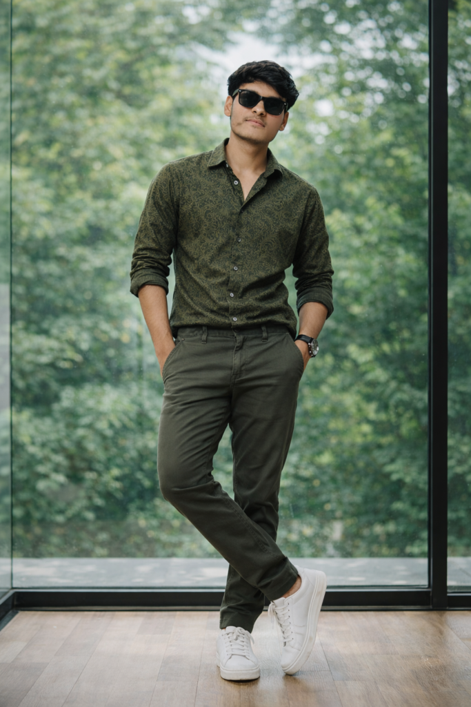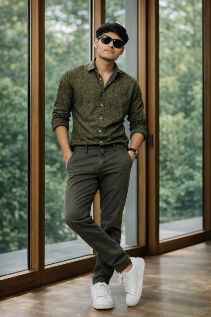 Create an image A stylish young Boy 18 years Boy standing casually indoors in front of tall wooden-framed glass windows with a lush green garden outside. He is leaning slightly against the window frame with one leg crossed over the other and both hands in his pockets. He is wearing a Sunglasses. He is dressed in an olive-green paisley patterned button-up shirt with sleeves rolled to the forearms, paired with slim-fit olive chinos. On his feet are clean white minimalist sneakers. A subtle wristwatch peeks out from his sleeve. The setting has soft natural daylight coming through the windows, creating a calm, elegant atmosphere. The background is slightly blurred with greenery visible outside. The wooden window frames add warmth to the composition. The pose is relaxed, confident, and fashionable. Photorealistic, ultra-detailed, sharp focus, natural lighting, shallow depth of field, high-end fashion photography, full-body shot, vertical composition, 85mm lens, cinematic color grading, soft shadows, realistic textures. Do not edit or change my face.