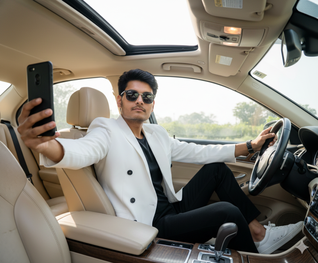 Create an image A realistic selfie of a young Boy stylish 18 years Boy sitting inside o herge luxury car interior with a panoramic sunroof open above. He is seated in the driver’s seat, slightly reclined, holling the camera with his left hand extended toward the lens, creating a wide-angle perspective. He is wearing a Sunglasses, and arcalm confident expression while looking directly into the camera He is wearing a white double-breasted blazer over a black t-shirt, slim black trousers, and clean white sneakers. One leg is bent and resting casually on the seat, giving a relaxed yet fashionable pose. The car interior is premium beige leather with wood trim on the door, visible gear shifter, Not Use byard, and sunlight coming through the sunroof. Outside the windows, soft greenery and trees are visible under a bright daytime sky. Lighting is natural daylight, soft and flattering. The shot has a slight wide-angle lens distortion typical of phone selfies, very sharp details, photorealistic skin texture, high resolution, cinematic clarity, realistic shadows, and balanced exposure. Style keywords: photorealistic, DSLR quality, natural light, luxury lifestyle, candid selfie, wide angle, shar focus, premium car interior, fashion portrait, Do not edit or change my face.