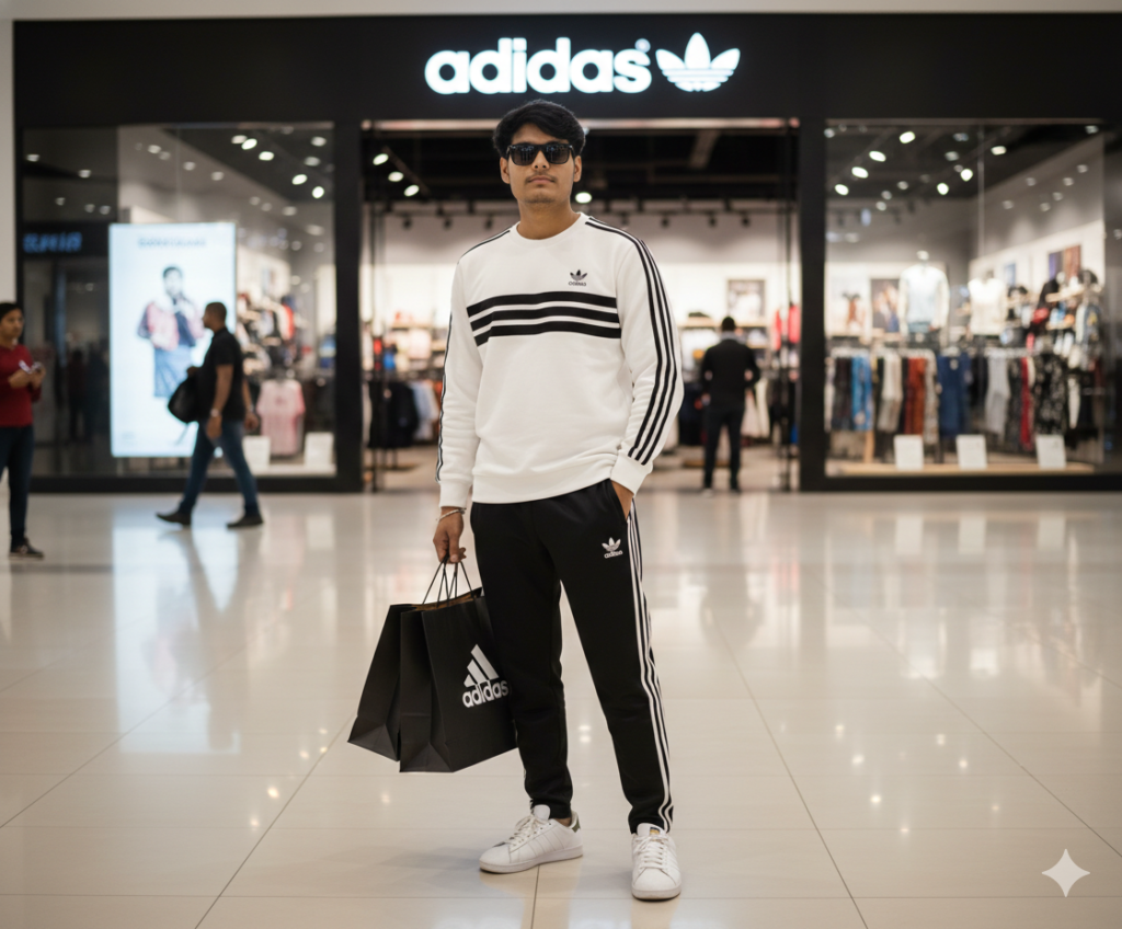 Create an image A stylish young Boy 18 years Boy standing inside a modern shopping mall in front of an Adidas store He is wearing a Sunglasses, and a confident, calm expression. He is wearing a white Adidas sweatshirt with black triple stripes running down both sleeves, black Adidas track pants with white stripes on the sides, and clean white sneakers. He is holding two black Adidas shopping bags in his left hand while his right hand rests casually in his pocket. The mall floor is glossy and reflective, with bright ambient lighting. Behind him, the Adidas storefront is visible with illuminated signage and glass walls. The background is slightly blurred (shallow depth of field), emphasizing the subject sharply in focus. The lighting is soft, balanced, and natural, giving a premium, lifestyle fashion photoshoot vibe. Full-body shot, eye-level angle, symmetrical composition, ultra-realistic photography, high detail, cinematic color grading, sharp focus, professional fashion photography, 4k resolution, Do not edit or change my face.