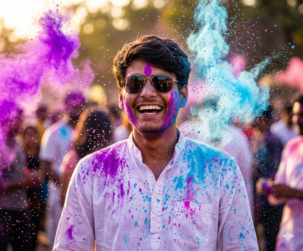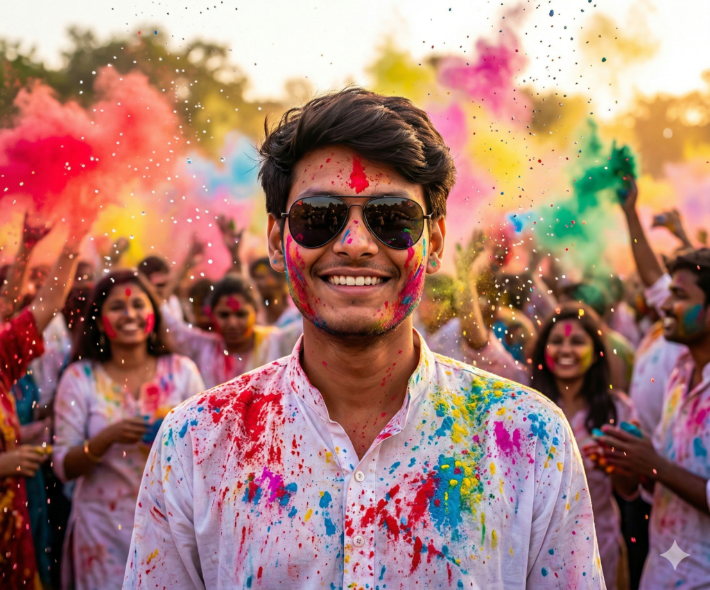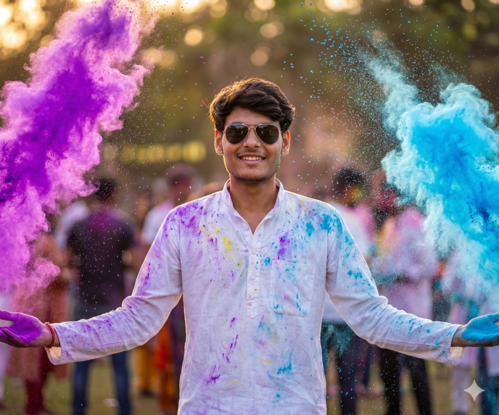 Ultra-realistic 8K high-speed Holi festival portrait of a young Indian Boy (STRICTLY use the uploaded reference image for 100% exact face and perfectly set hairstyle – no modification in facial structure, hairline, hair length, texture, or volume, Hairstyle must remain neatly styled and identical to reference.) Confident natural smile with joyful festive energy, direct eye contact with camera. He is wearing a crisp white kurta and stylish sunglasses, partially soaked and covered in vibrant gulal. Complete Holi environment: Massive colorful gulal clouds (neon purple, sky-blue, pink, yellow, orange) exploding in the air, people laughing and throwing colors, pichkaris spraying water, festive crowd dancing in background, realistic motion blur for depth Fine powder particles and water droplets suspended mid-air, perfectly frozen in motion. Cinematic golden-hour lighting with dramatic backlight creating glowing rim light around his silhouette, Ultra-detailed skin texture, realistic color blending on face and clothes, visible wet fabric folds. Soft bokeh background but clearly festive Holi atmosphere. DSLR depth of field, ultra-sharp focus on face and hair, dynamic mation freeze, vibrant contrast, hyper-detailed, photorealistic, masterpiece quality, Do not edit or change my face.