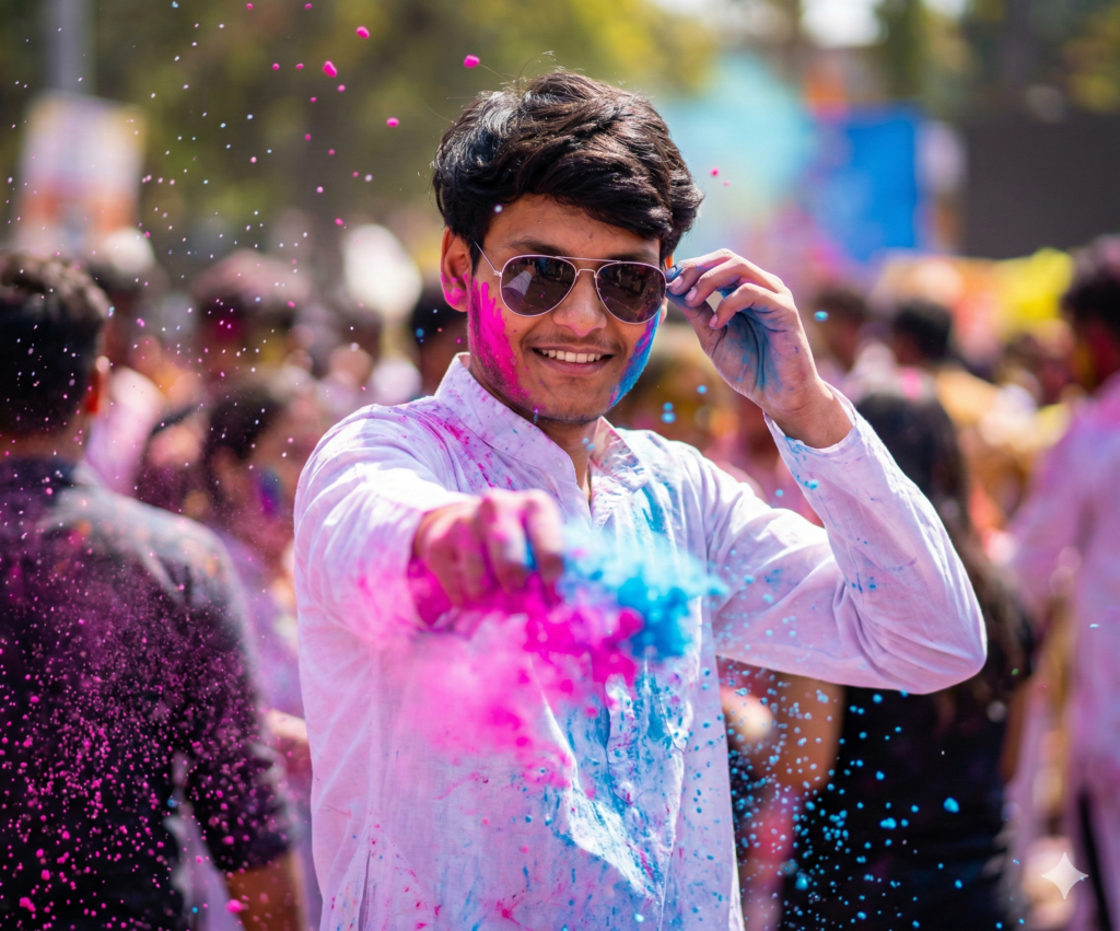 Ultra-realistic 8K high-speed Holi portrait of a young Indian boy STRICTLY use uploaded reference image for 100% exact face & hairstyle – no modification at all. Same haircut, hairline, volume, direction, texture: perfectly groomed, natural shine. Facial features completely untouched. Pose: Slight side turn, one hand throwing neon pink & electric blue gulal toward camera, other hand adjusting sunglasses. Natural joyful smile. Crisp white kurta getting color splashes. Fine gulal particles & water droplets frozen mid-air. Soft bokeh Holi crowd background, cinematic golden-hour rim light. DSLR depth of field, ultra-sharp focus on face & hair, dynamic motion freeze, vibrant contrast, photorealistic masterpiece, Do not edit or change my face.