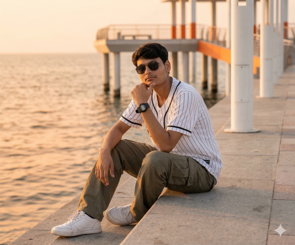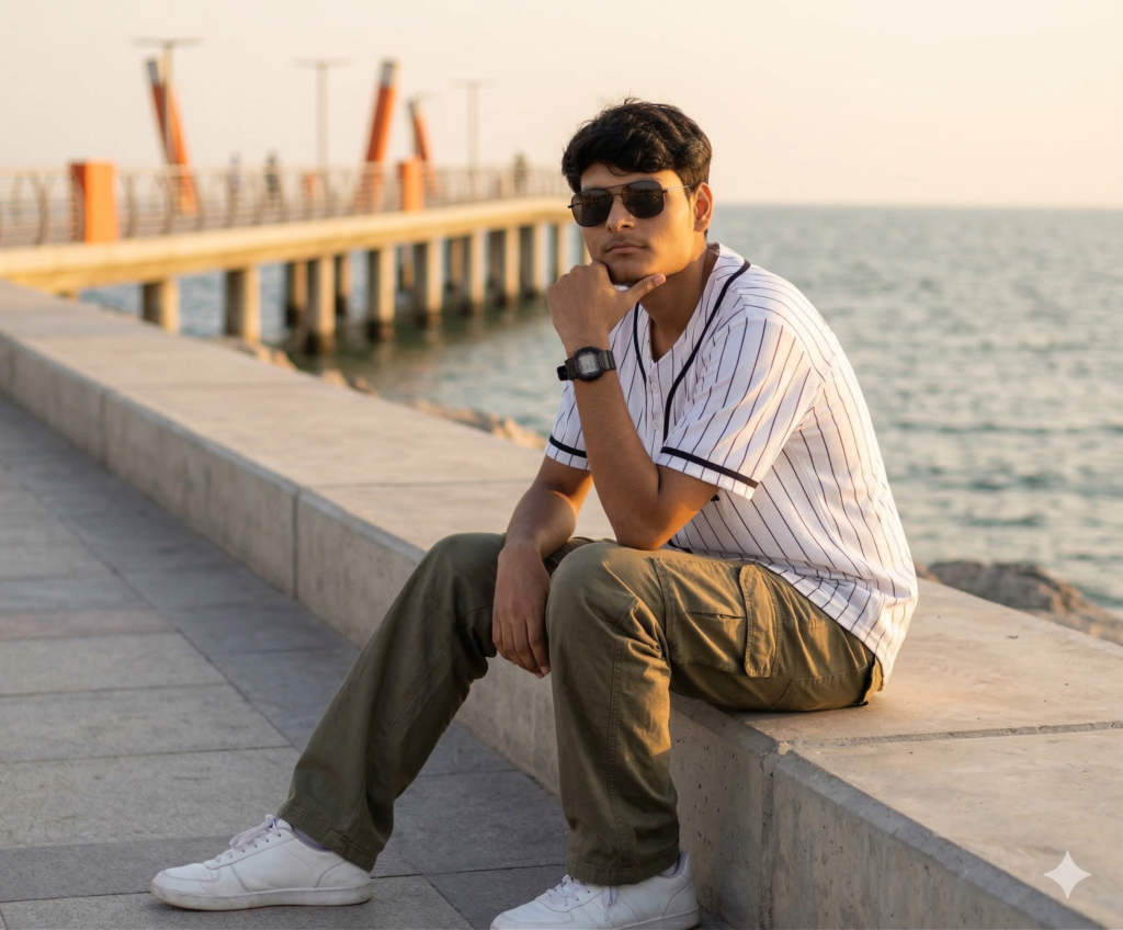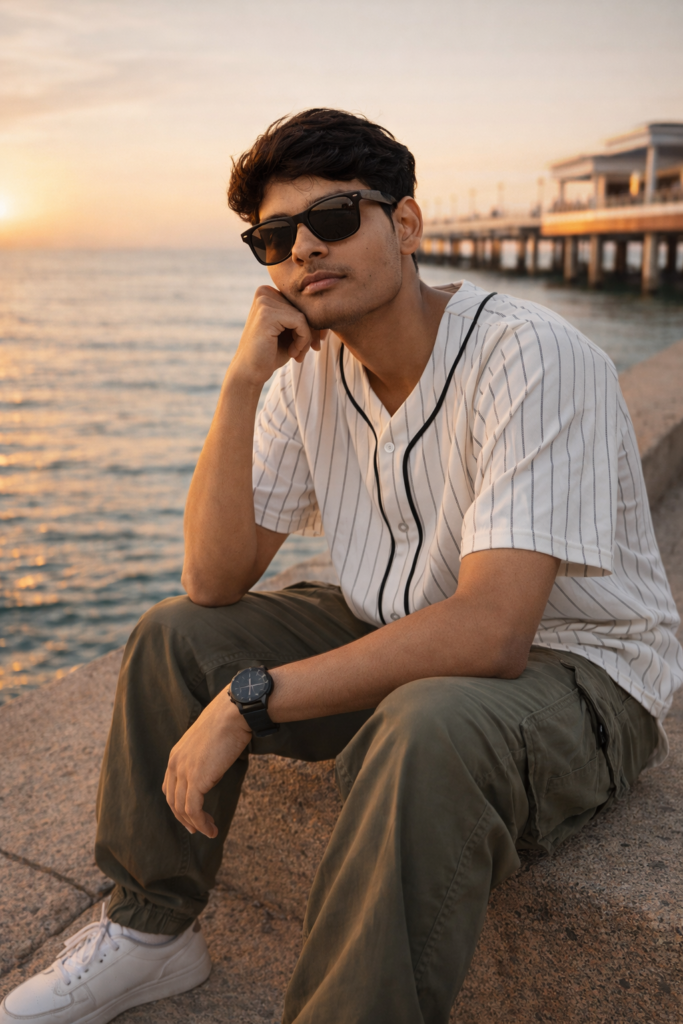 Create an image A stylish young man sitting casually on a concrete sea-side promenade during golden hour sunset. He is leaning forward with one elbow resting on his knee and his chin supported by his hand, He is wearing a Sunglasses. He wears a white pinstriped baseball jersey with black piping, loose olive green cargo pants with large side pockets, white sneakers, and a black digital wristwatch. The background shows calm ocean water and a modern pier structure with white pillars and orange accents. The lighting is warm, soft golden sunlight casting gentle shadows and a cinematic glow. The mood is relaxed, confident, and aesthetic. Shot in high resolution with shallow depth of field, natural colors, realistic skin tones, and sharp details. Perspective at eye level, slightly angled, capturing full body seated pose on the ledge. Style keywords: photorealistic, golden hour lighting, coastal vibe, candid pose, fashion portrait, DSLR quality, soft shadows, warm tones lifestyle photography, Do not edit or change my face.