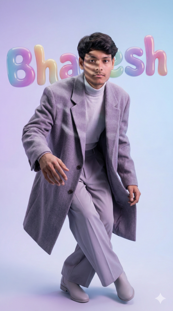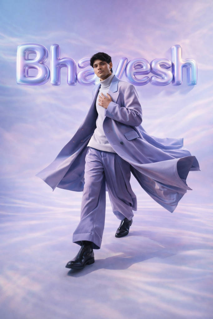 Create a futuristic luxury male fashion portrait in 9:16 ratio featuring dynamic moving light-wave shadows sweeping softly across the subject, while the background shifts to a *light-toned gradient blend of purple and soft sky blue, creating a clean premium atmosphere. Camera POV is very close and slightly low, giving strong immersive editorial presence. Pose is highly unique and premium: the model leans forward with one leg slightly crossed, torso angled elegantly, one hand extending toward the camera with relaxed fingers while **the other hand rests naturally by the side, perhaps lightly holding the edge of the coat or resting on the thigh, creating a grounded and cool aesthetic instead of touching the neck. Expression is calm, confident, and magnetic with subtle softness in the gaze. Outfit styling must feel rare and high- end: oversized luxury lavender-gray tailored coat with subtle texture, layered lightweight knit turtleneck in muted pastel tone, wide flowing designer trousers with elegant drape, and refined minimalist boots. Fabric detail, folds, and depth must be highly visible. Behind the subject, include *large colorful 3D bubble-style text displaying a “Bhavesh”, floating naturally and matching the purple-light blue gradient environment. The text should be glossy, semi-translucent, playful yet premium, integrated seamlessly into the scene without overpowering the model. Lighting combines soft projected wave shadows with diffused editorial fill for cinematic depth and smooth skin rendering. Camera settings: 50mm prime lens, aperture f/1.8, ISO 100, shutter 1/250. Vertical composition must feel bold, futuristic, luxurious, and scroll- stopping ultra-detailed 8K fashion editorial realism, no neon, clean premium aesthetic, Do not edit or change my face.