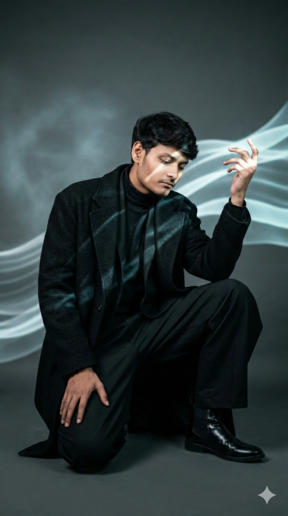 Create an ultra-premium editorial male portrait in 9:16 ratio with flowing light-wave shadows moving across the subject and background, producing a cinematic sense of motion. Camera POV is very close and slightly low for immersive impact. Pose is highly unique: the model crouches slightly while leaning forward, one hand resting on the thigh for balance and the other hand reaching upward as if interacting with the moving light, fingers relaxed and elegant. Expression is composed, powerful, and introspective with soft confidence. Outfit styling: oversized luxury black ensemble featuring textured long coat, layered turtleneck, wide sculptural trousers, and refined boots with subtle shine. The clothing must feel high-end and fashion- forward with realistic fabric folds. Background: dark matte gray studio environment with gentle haze enhancing volumetric light waves. Lighting combines sharp projected light lines with soft diffused fill to maintain facial detail and cinematic depth. Shadows sweep organically across the frame, adding movement without blur. Camera settings: 50mm prime lens, f/1.8, ISO 100, shutter 1/250. Vertical composition should feel rare, artistic, and scroll-stopping blending futuristic elegance with minimalism. Ultra-detailed 8K realism, professional editorial quality, strong composition, no neon colors, no random text elements, Do not edit or change my face.