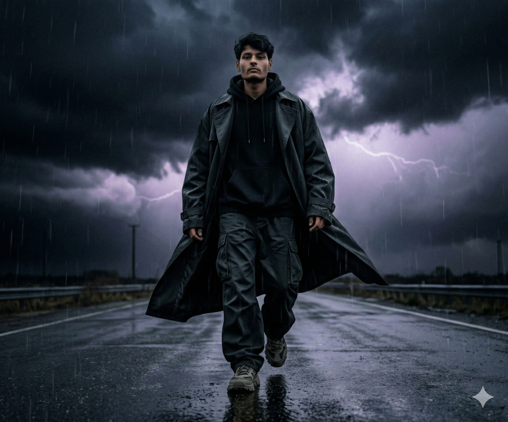 A low-angle dynamic, long-range, cinematic shot of a figure walking with purpose across a wet, deserted industrial road towards the camera. The background is a massive, dark storm system with occasional, restrained flashes of soft, muted lavender thunder breaking through the deep black clouds. The lighting is dim and moody. The subject wears a huge, billowing dark trench coat over an oversized hoodie and excessively loose pants. One leg is mid-stride, showing off large, rugged bold sneakers. They look directly ahead with a determined expression, their face clear in the moody light. The wet ground reflects the subtle purple sky tint. Hyper-realistic, detailed textures, Do not edit or change my face.