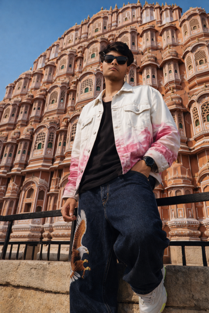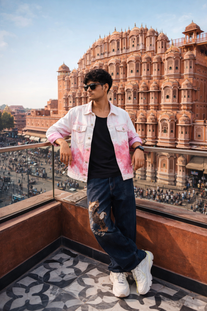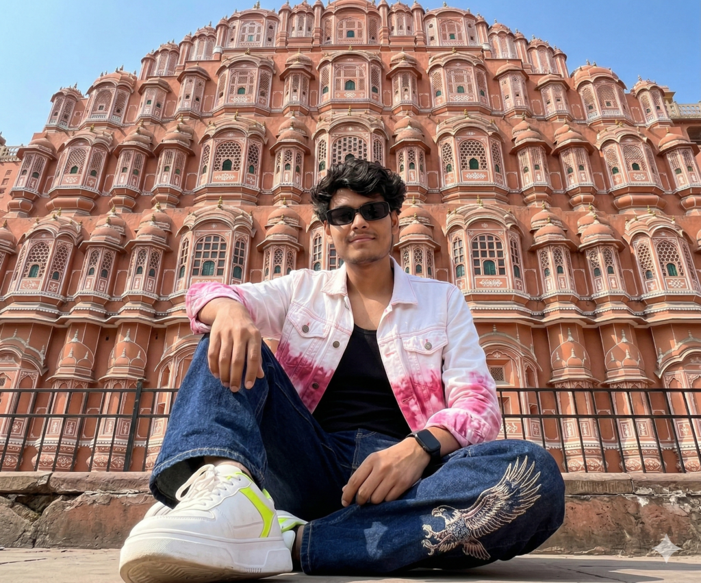 FOCUS: A 18 YEARS OLD YOUNG BOY STANDING IN A AESTHETIC POSE IN FRONT OF THE HAWA MAHALIN JAIPUR WITH A CONFIDENT, RELAXED EXPRESSION LOOKING TOWARDS THE CAMERA.