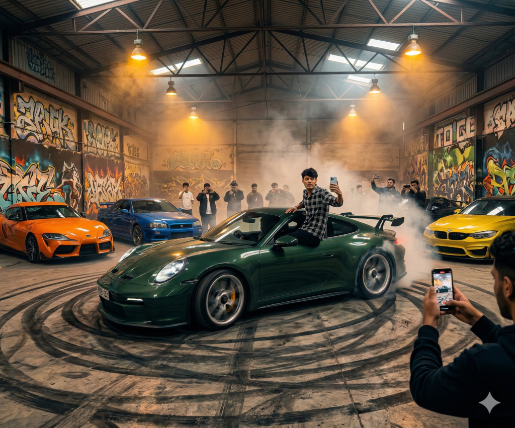 Shot with iPhone 17 Pro, 1x lens (no wide distortion), ultra high resolution, extremely sharp textures. detailed car reflections, realistic motion blur on wheels only, professional street racing photography style, Do not edit or change my face.