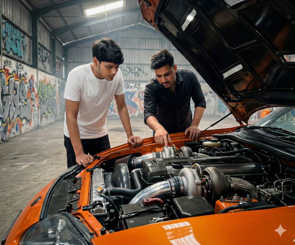 Scene inside the graffiti warehouse. An orange Toyota Supra with the hood open reveals a highly detailed twin turbo engine setup. The second character is leaning over the engine bay explaining something. pointing at the twin turbos. The main character (wearing the exact uploaded outfit reference) is standing next to him, focused on the engine.