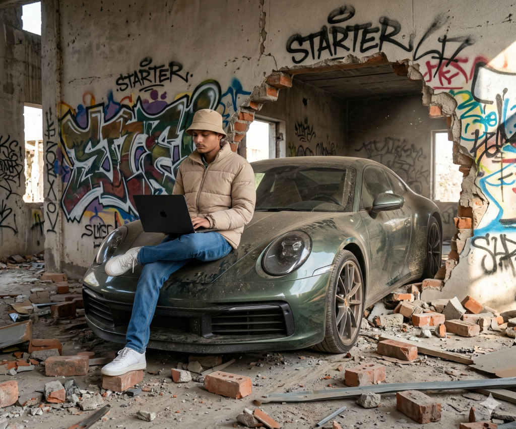 Recreate a hyper realistic scene inside an abandoned concrete building covered in colorful graffiti. A dark green Porsche 911 appears crashing halfway through a broken concrete wall, debris and bricks scattered on the ground. The character is sitting on the hood of the Porsche, wearing the exact outfit from the uploaded clothing reference (beige bucket hat, beige puffer jacket, blue jeans, white sneakers), working on a black laptop.