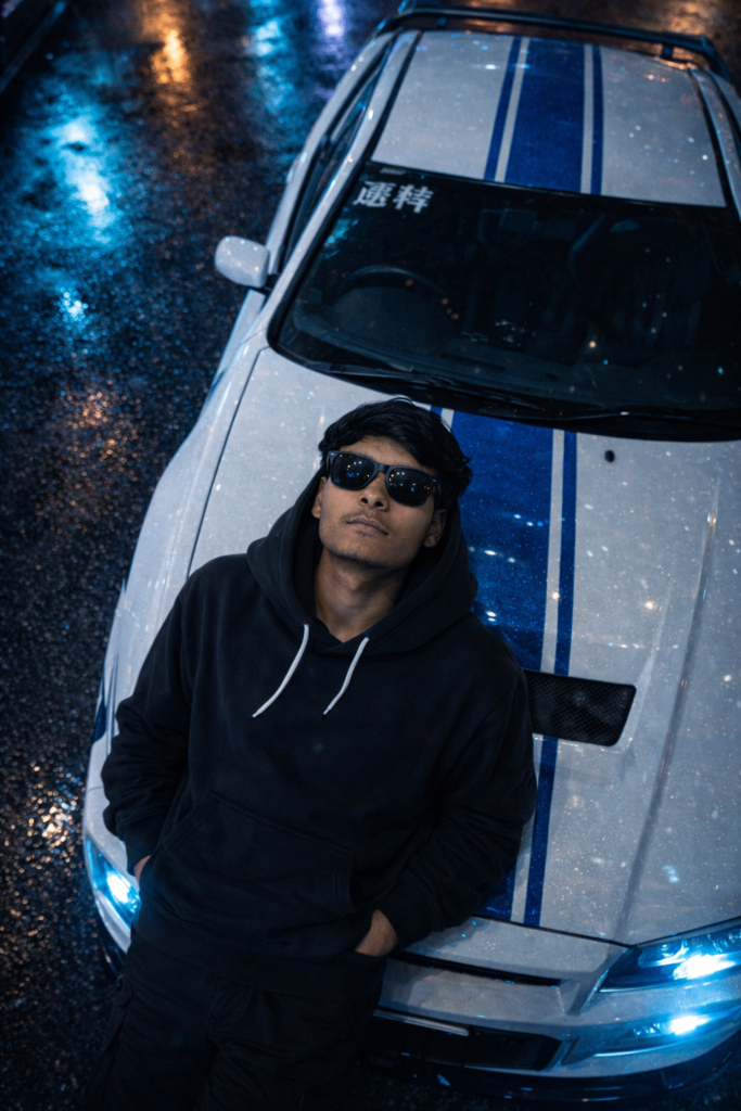 Ultra realistic cinematic scene. Extreme top-down bird’s-eye view shot. The reference person leaning against a modified Japanese street car with blue racing stripes. use sunglasse,Night urban street, wet asphalt reflecting neon blue lights. The reference person looking straight up at the camera, relaxed confident posture, streetwear hoodie style. Strong Tokyo street racing atmosphere, realistic lighting, natural shadows, sharp details, cinematic color grading. AR 4:5, Do not edit or change my face.