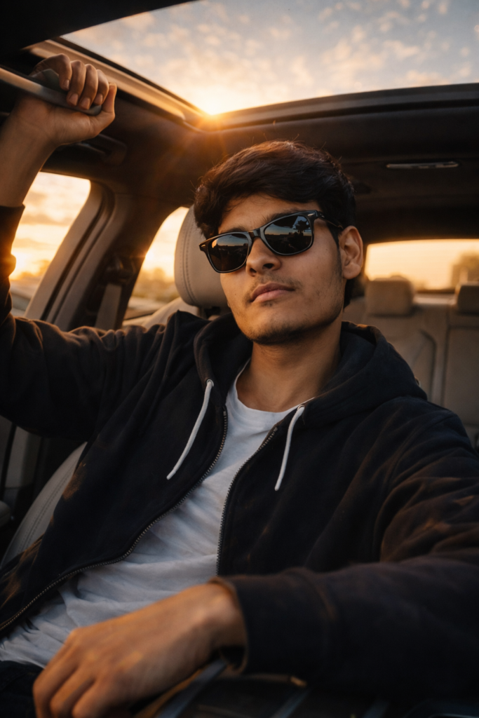 Ultra-realistic cinematic medium close-up inside a luxury car. Natural sunlight entering through the open panoramic sunroof, use sunglasse, warm golden hour light hitting the face. The reference person wearing dark sunglasses, relaxed in the driver’s seat, one arm resting on the center console, the other hand holding the roof handle. Calm, confident expression, slightly tilted head. Casual modern outfit with a white t-shirt and dark jacket. Shallow depth of field, realistic skin texture, natural shadows, premium car interior details, lifestyle photography, cinematic color grading. AR 4:5, Do not edit or change my face.