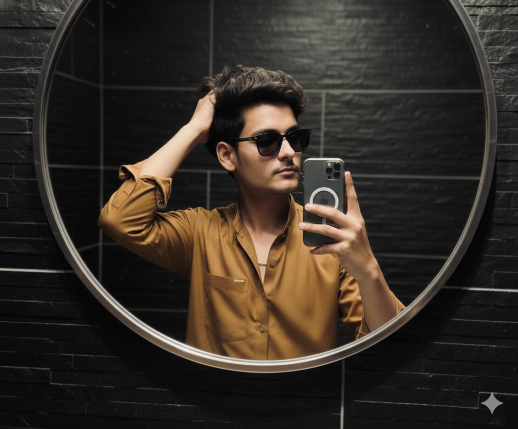 A stylish man taking a mirror selfie in a modern, dim-lit room with a textured black stone wall background He is wearing Golden brown shalwar kamees slightly open at the chest, use sunglasses, hand hair move, revealing a thin silver chain His hair is neatly styled with a voluminous wave. The circular mirror framing adds depth and symmetrycreating a sleek #classy, and confident atmosphere.make messy hair like korean.dont change my face. Do not edit or change my face.