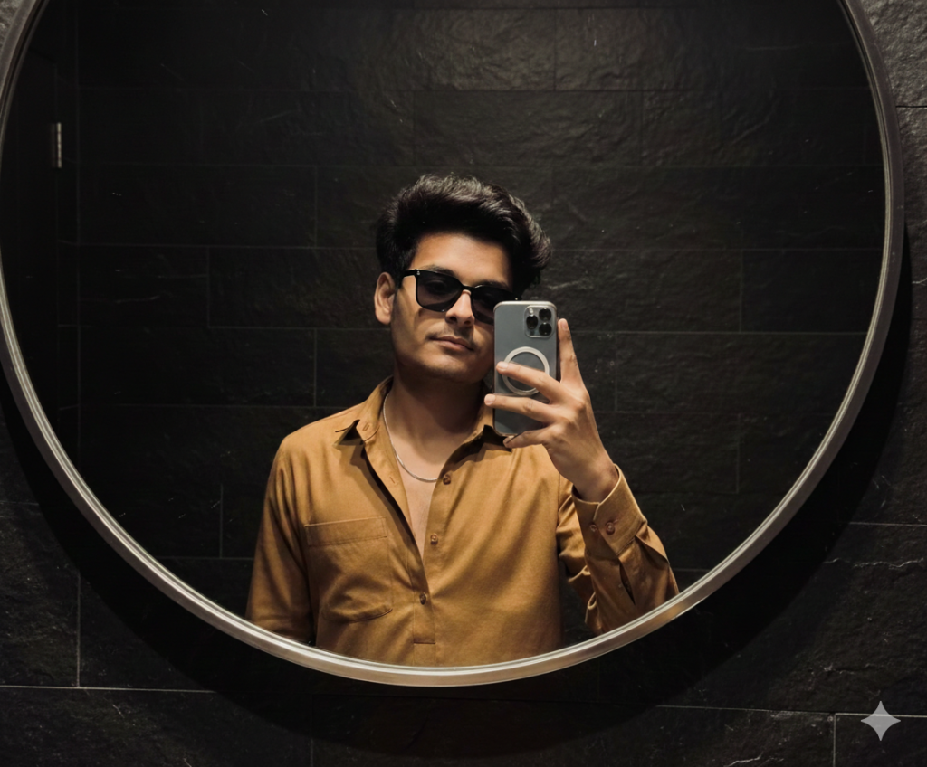 A stylish man taking a mirror selfie in a modern, dim-lit room with a textured black stone wall background He is wearing Golden brown shalwar kamees slightly open at the chest, use sunglasses, revealing a thin silver chain His hair is neatly styled with a voluminous wave. The circular mirror framing adds depth and symmetrycreating a sleek classy, and confident atmosphere.make messy hair like korean. Do not edit or change my face.