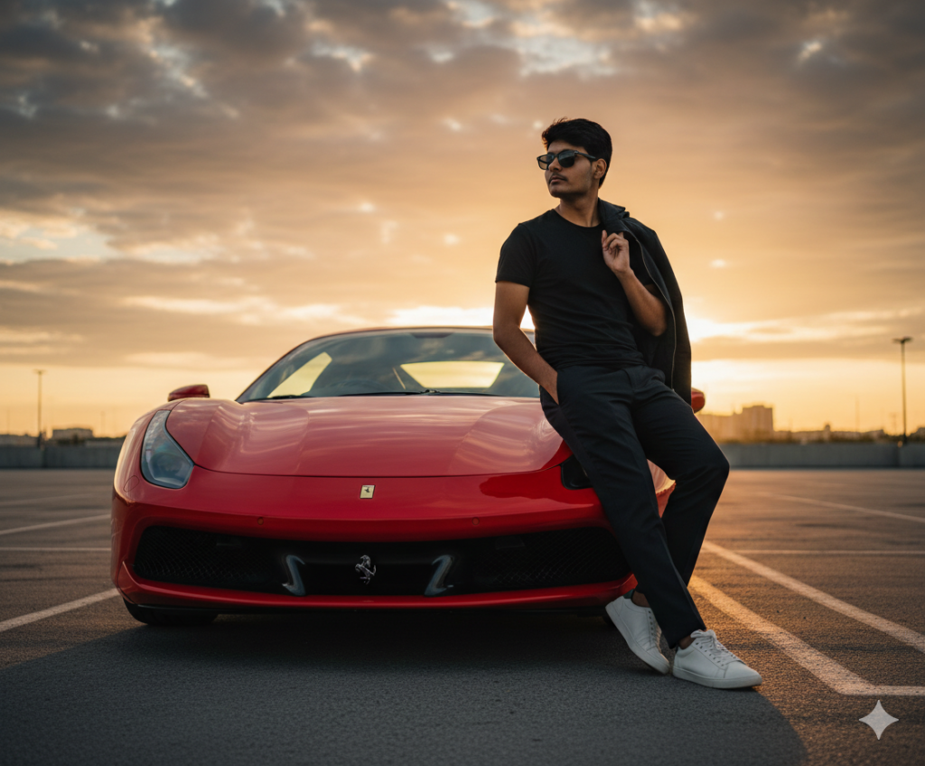 Ultra-realistic cinematic medium shot. Slightly low angle, diagonal composition. The reference person leaning against a red sports car, body turned away while looking toward the horizon. Relaxed confident posture, use sunglasses, one foot crossed, casual luxury outfit, jacket casually over the shoulder. The car fills a strong portion of the frame, emphasizing the front lights, aggressive grille, and glossy red paint. Open parking lot at sunset, dramatic cloudy sky with warm golden light. Natural lighting, realistic reflections, cinematic color grading, shallow depth of field, high-end photography, calm yet powerful mood. AR 4:5,Do not edit or change my face.