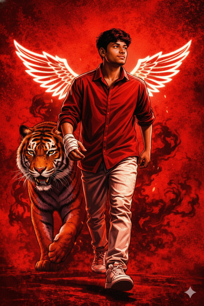 Create a cinematic of the person in the reference photo Maintain the exact face identity hairstyle, expression skin tone and pose with zero distortion Transform the entire scene into a deep red high contrast Tamil gangster movie poster style. Replace the background with red gradients smoky atmosphere and subtle textures. Add bold comic book shading thick outlines, strong black shadows and glossy highlights on the skin and clothes. Stylize the outfit with richer tones clean folds and dynamic lighting while keeping the, design Add intense highlights to the jawline cheekbones and edges of the body. Maintain the original pose and attitude Create a gritty powerful cinematic mood with dramatic lighting and high contrast Ultra-detailed sharp lines vibrant red atmosphere action movie poster energy, 4K illustration me and tiger walking forward, me doing bandaging to my hand and looking out off camera, one step ahead, wear red shirt and white jeans and sneakers, hand behind me, show white glowing neon illustration wings behind me, confidently out of camera, make sure head to toe visible, ensure 100% facial accuracy and consistency, Â Do not edit or change my face.