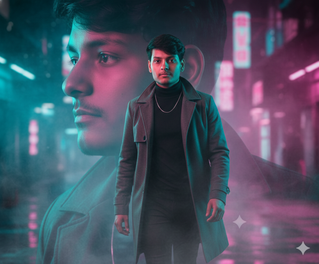 The Cinematic Neon Noir Concept: A moody, high-end editorial shot in a rain-slicked metropolis, perfect for a striking social media presence. The Prompt: Ultra-realistic digital photography. make sure head to toe visible. one step ahead, powerful walking, Subject: me with a dusky skin tone, me walking confidently through a neon-lit cyberpunk city street at night. Outfit: A tailored charcoal- grey trench coat over a fitted black turtleneck, accessorized with a minimalist silver chain. Facial Consistency Constraint: Use the provided saved reference image to ensure 100% facial accuracy and consistency. The facial features and structure must remain perfectly identical to the reference and should not be changed or replaced; only adapt the angle and catchlights to match the environmental neon lighting. Lighting & Atmosphere: Cinematic, cinematic rim lighting from neon pink and cyan signs, rain-slicked streets reflecting the glow, atmospheric fog in the background. Camera Specs: Shot on an 8K medium format camera, 35mm lens, f/1.4 aperture for a shallow depth of field, dramatic and moody bokeh. The background should be an artistic high-contrast composition featuring a blurred close-up profile of the same face, I am not in high-contrast, subtle smile, intense pink and cyan smoke effect swirling on floor, high-contrast profile looking left off camera, me looking front. 100% facial accuracy and consistency, Do not edit or change my face.