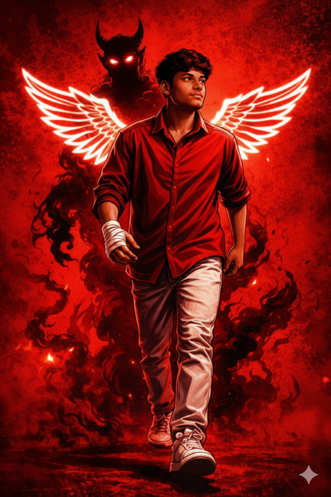 Create a cinematic of the person in the reference photo Maintain the exact face identity hairstyle, expression skin tone and pose with zero distortion Transform the entire scene into a deep red high contrast Tamil gangster movie poster style. Replace the background with red gradients smoky atmosphere and subtle textures. Add bold comic book shading thick outlines, strong black shadows and glossy highlights on the skin and clothes. Stylize the outfit with richer tones clean folds and dynamic lighting while keeping the, design Add intense highlights to the jawline cheekbones and edges of the body. Maintain the original pose and attitude Create a gritty powerful cinematic mood with dramatic lighting and high contrast Ultra-detailed sharp lines vibrant red atmosphere action movie poster energy, 4K illustration me walking forward, I am doing bandaging to my hand white walking and looking out off camera, one step ahead, wear red shirt and white jeans and sneakers, hand behind me, show white glowing neon illustration wings behind me, confidently out of camera, make sure head to toe visible. Standing behind him is a tall, menacing shadowy figure made of dark smoke with glowing white eyes and sharp horns. The black smoke swirls around the man’s body in cinematic way. The background is a clean, neutral grey, creating a dramatic and supernatural aesthetic, ensure 100% facial accuracy and consistency, Â Do not edit or change my face.