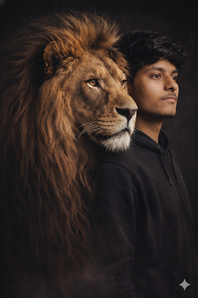 sam hi Portrait of a confident me standing next to a majestic lion, both facing forward in profile. The lion’s mane blends seamlessly with the woman’s hair, creating a sense of unity between them. The me is dressed in a simple black hoodie, exuding calm and strength. The lion’s intense gaze and the woman’s serene expression complement each other. The background is dark, enhancing the powerful and elegant aura of both figures. –v 7 –quality 1-ar 9:16 –chaos 0 –stylize 100–weird 0 — exp 1, ensure 100% facial accuracy and consistency,  Do not edit or change my face.