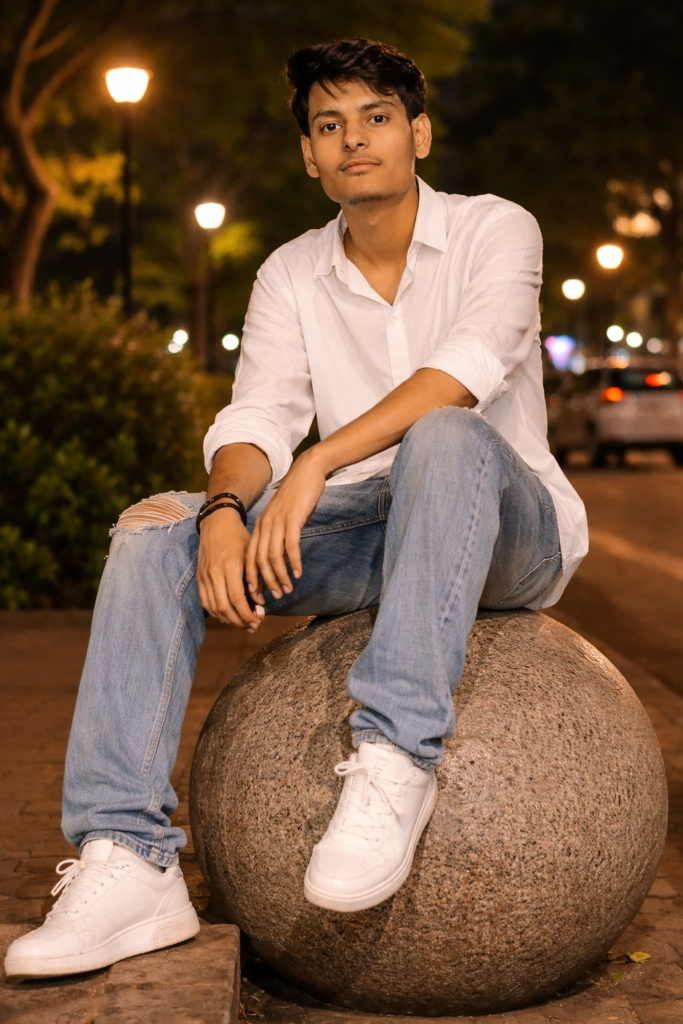 A young man (use refrence image) is sitting casually on a large stone sphere at night in an outdoor park or urban area, illuminated by streetlights. He is wearing a loose white shirt with rolled sleeves and loose, slightly baggy blue ripped jeans, paired with white sneakers. His hairstyle is trendy and voluminous. The background features blurred lights, greenery, and a parked car. The fashion vibe is relaxed, and urban, with comfortable, loose-fitting) clothes. Do not edit or change my face
