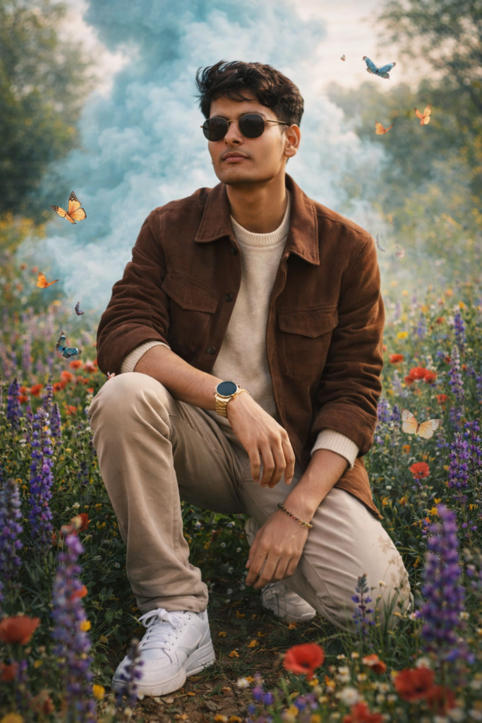 A photorealistic fantasy portrait of me. I am kneeling on one knee in a vibrant meadow of colorful wildflowers, including purple lupines and red poppies. I’m looking off to my right with a thoughtful expression. I’m wearing a brown jaeket, A sunglasses use a cream sweater, beige trousers, and white sneakers, with a watch on my left wrist. Butterflies are in motion around me, and a large plume of light blue smoke rises in the background. Natural, soft lighting, sharp focus, 8K, highly detailed. Do not edit or change my face