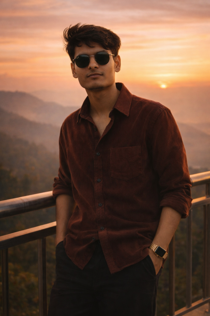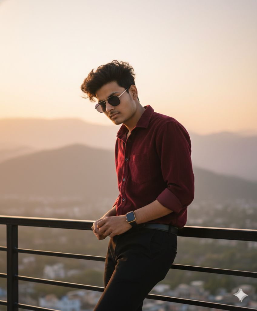 A cinematic portrait of a stylish young man leaning casually on a terrace railing at sunset(use reference photo), wearing a deep maroon corduroy shirt with rolled-up sleeves, black trousers, sunglasses, and a golden smartwatch. Messy hair, bathed in warm golden light. In the background, misty mountains and a pastel-colored sky fade into the horizon, creating a dreamy, cinematic atmosphere Do not edit or change my face