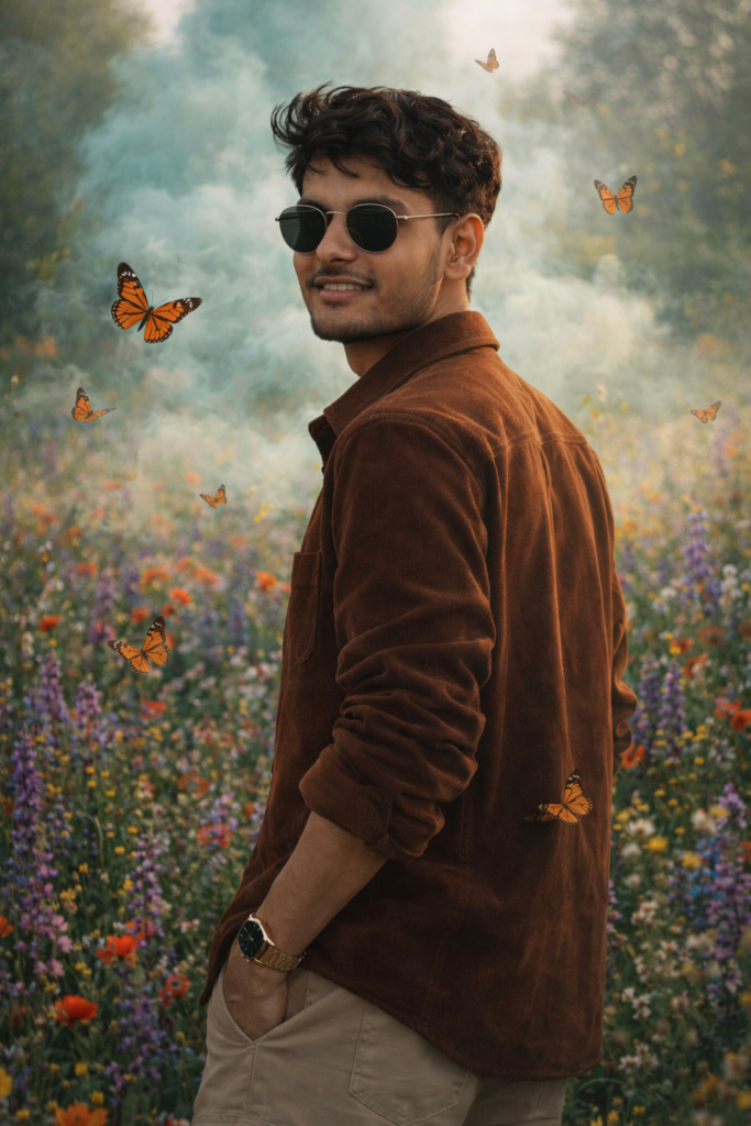 A magical, photorealistic portrait of me. I’m standing in a vibrant field of colorful wildflowers, looking back at the camera with a confident smile. My dark, sunglasses, styled hair and beard are in sharp focus. I’m wearing a brown jacket over a cream sweater and beige trousers, with my left hand in my pocket. Monarch butterflies fly around me, and soft, light-green smoke drifts in the air. Ethereal lighting, sharp focus, 8K, fantasy portrait. Do not edit or change my face.