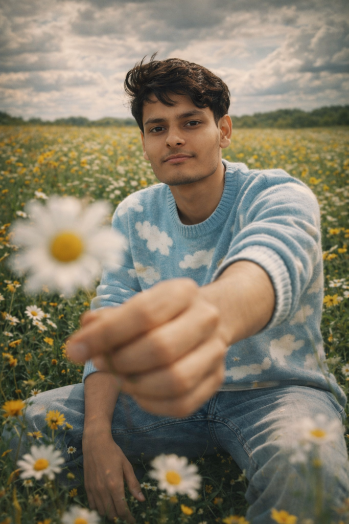 A cnematic, wide-angle portrait of Ang man sitting in a wildflower field during the day. Hais leaning slightly forward with one arm extended, holding a daisy toward the camera, blurring the flower in the foreground. He has a soft charming expression and messy hair. He wears a sky blue sweater with white cloud patterns and light wash denim jeans. The field is full of yellow wildflowers and daisies under a dramatic, partly cloudy sky. The lighting is natural and soft, with a warm, vibrant color grade and a hint of vintage film tones. The photo has a shallow depth of field and an editorial style composition, creating a nostalgic and dreamy mood. Do not edit or change my face.
