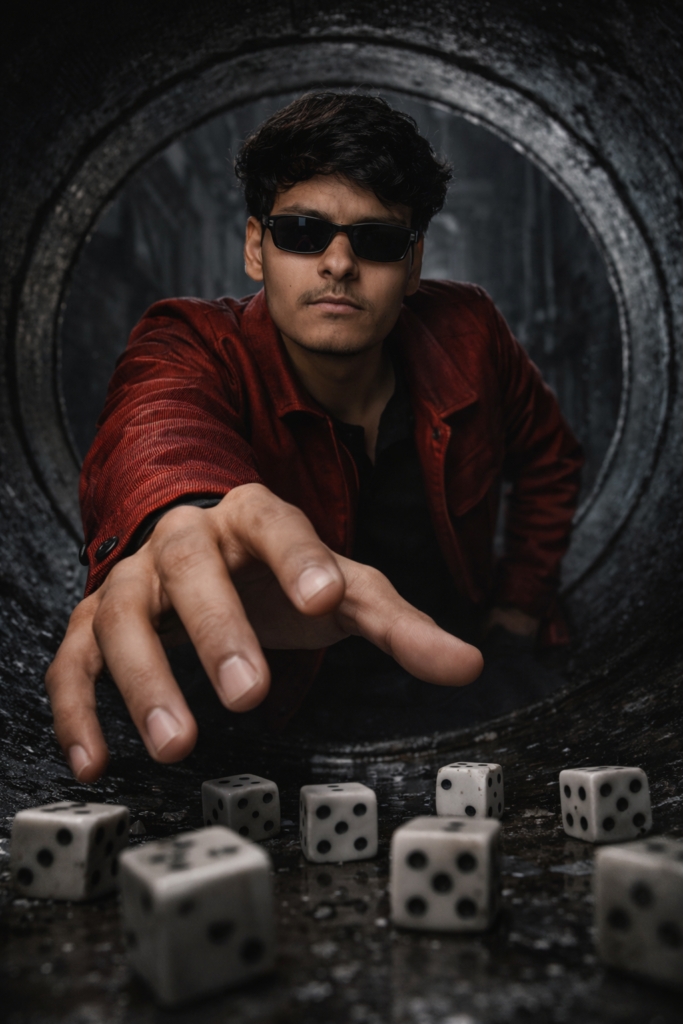 Ultra-realistic photorealistic cinematic portralt strictly based on the provided lace 1:1-preserve texture and natural Imperfections. No beautification, no reshaping Keep exactly the same sudic tnghe red Jacket with the same fabric sheen, fol short textured hair, mesty, Keep exactly the same accessories length and volume black wraparound unglish with identical shape on fingers Keep exactly the same pose and composition low-angle mac-ylu shut One hand reaching forward toward the c fargers extended, dominating the Dice scattered on the surface in front, same scale and placement feel Subject posidoned inside a drcular tunnet/pipe opening, framing the body and hmad Keep exactly the same facial expression and winxa cold, focused, corifident masculine expression, neutral lips, no amide, no softness Heplace the face with my house frun the apred photo, sanily Integrated with correct perspective and lighing Perfect lace-uvan readers accurate shadina algnment, named Keep exactly the sanie background and emironmenc dark Industrial time/ cerular genery, wet reflectee scat due in fragmund Na changes, no added objects, no vehicles. blending no artifacts. Preserve the original color grading exactly as in the reference frast, red jacket and the dominant n. cinematic highlight No coler shifts, no warming or cooling beyond the reference Lighting dramatic directorat kighit omphasizing hand, ing and Strong depth separation between foreground and background Nan-pretty, bold, dominant presence Ultra-detailed skin texture, fabric grain, and dice surfaces clearly reartat High-end OSLR/crematik quality, editorial concept portran, high retok Negative prompt: harge of outfit, different prose, different hand position, different background, ifferent color grading, smile, soft or feminine feston beauty fiter, plastic skin, cartoon, Tustration, Cal look, blur on subject bad anatomy, diserted hands, watra fingers, lace much, Do not edit or change my face.