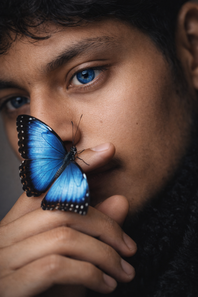 Ultra-high detall, macro lens look, shallow depth of field, professional studio lighting, 8K resolution, photorealistic, luxury editorial aesthetic. A luxury, hyper-realistic close-up portrait shot of a human face and hand. The frame captures the person from a tight side-angle close-up, focusing on one eye, part of the nose, lips, and the hand raised gently in front of the face. A vivid blue morpho butterfly is delicately perched on the person’s finger. Its wings partially open, revealing Intricate Iridescent blue patterns and fine wing textures. The person’s eye color perfectly matches the butterfly’s blue, with crystal-clear iris detalls, visible limbal ring, natural reflections, and subtle light catching the moisture of the eye. The gaze is calm, soft, and deeply focused on the butterfly, conveying serenity, connection, and quiet wonder. The butterfly is sharply in focus, showing ultra-fine details of its wings, veins, antennae, and soft body hairs. The Interaction feels intimate and gentle, with no tension or movement. The person wears a black furry coat, only slightly visible at the edge of the frame due to the close-up composition. The fur texture is rich, soft, and luxurious, adding depth and contrast without overpowering the subject. Lighting is soft, cinematic, and directional, emphasizing skin texture, eye realism, butterfly Iridescence, and fur detail. Background is minimal, softly blurred, and neutral, ensuring full attention remains on the eye-to-butterfly connection. Ultra-high resolution, photorealistic skin pores, natural color grading, shallow depth of field, editorial luxury photography style, calm and ethereal mood, no text, no logos, no distortion, no extra subjects, Do not edit or change my face.