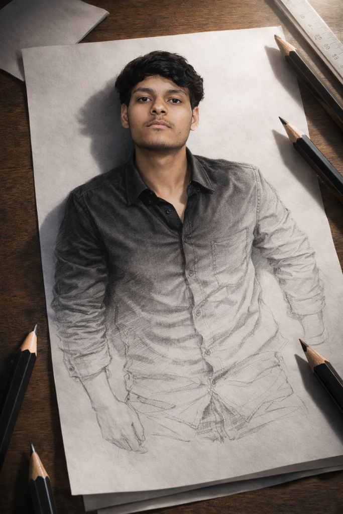 A composition called Trompe L’Oeil 3D, in which the subject – using the face raised as a reference – is a large-scale, clean white paper image and a sketch of graphite that appears in the real world. The upper part of the body renders the subject completely in hyper-realistic color and texture, applied like black sharp with wet and dry silk effects, while the lower part of the body still looks like a 2D pencil sketch on paper. Shot from an aerial perspective (top-down) using a 24mm lens to cover the entire environment on the table, including the pencil and pencil-sized giants scattered around. Pencachayan is a fusion between lighting studio data for area maps and side lighting with a dramatic volumetric effect for the figure 30 that appears, creating a realistic image that falls back into the area sketch. Resolution 8K, ray tracing, and advanced shading techniques used to blur the boundaries between illustration and area, Do not edit or change my face.
