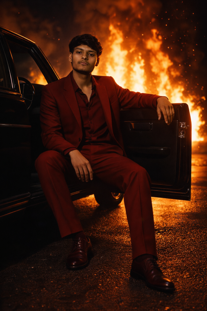 Ultra-realistic cinematic night scene, intense dramatic atmosphere, a luxury classic car parked with the driver door open while massive flames rise behind the vehicle, fire illuminating the scene with warm orange highlights against deep black shadows, a confident young adult male sitting casually on the edge of the open car door, body language calm, dominant and masculine, facial identity REFERENCE-GUIDED ONLY from my provided photo with natural reconstruction, no face swap, no pasted face, no identical copy, perfectly integrated skin, lighting and anatomy, clean-shaven face, sharp jawline, defined cheekbones, strong masculine bone structure, realistic pores and matte skin texture, wearing a full red suit (jacket and trousers), tailored and elegant, masculine cut, trousers not skinny, slightly relaxed straight fit, premium fabric with subtle texture, jacket worn open with confident styling, matching elegant dress shoes appropriate to the suit dark or deep red tone, realistic proportions, natural stance, cinematic pose identical to the reference image composition, one arm resting loosely, relaxed but powerful posture, environment lit by fire glow and soft cinematic rim light, sparks and heat distortion subtly visible in the air, asphalt ground reflecting warm highlights, high-contrast cinematic lighting, moody shadows, editorial fashion photography style mixed with cinematic realism, shallow depth of field, sharp focus on subject, background flames slightly softened, photorealistic, no illustration, no cartoon, no Al artifacts, 8K ultra-detail, professional commercial photography look, no text, no logos, no watermark. ercial photography look. No text, no logos, no watermark, Do not edit or change my face.